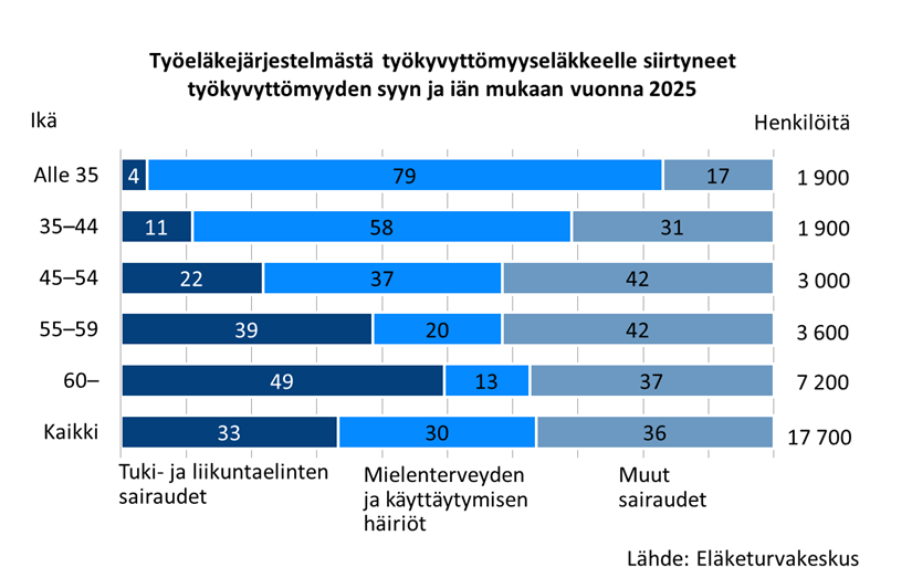 Vuonna 2025 työeläkejärjestelmästä siirtyi työkyvyttömyyseläkkeelle 17 650 henkilöä. Määrä pysyi samansuuruisena edeltäviin vuosiin verrattuna. Edellisvuoden tapaan yleisin syy siirtyä työkyvyttömyyseläkkeelle oli tuki- ja liikuntaelinten sairaudet. Niiden osuus oli kolmannes siirtyneistä. Mielenterveyden ja käyttäytymisen häiriöt olivat toiseksi yleisin työkyvyttömyyden syy (30 %). Muiden sairauspääryhmien osuudet olivat selvästi pienempiä. Työkyvyttömyyseläkkeelle siirtyneistä lähes kaksi kolmasosaa oli 55 vuotta täyttäneitä. Alle 35-vuotiaiden osuus oli 11 prosenttia.