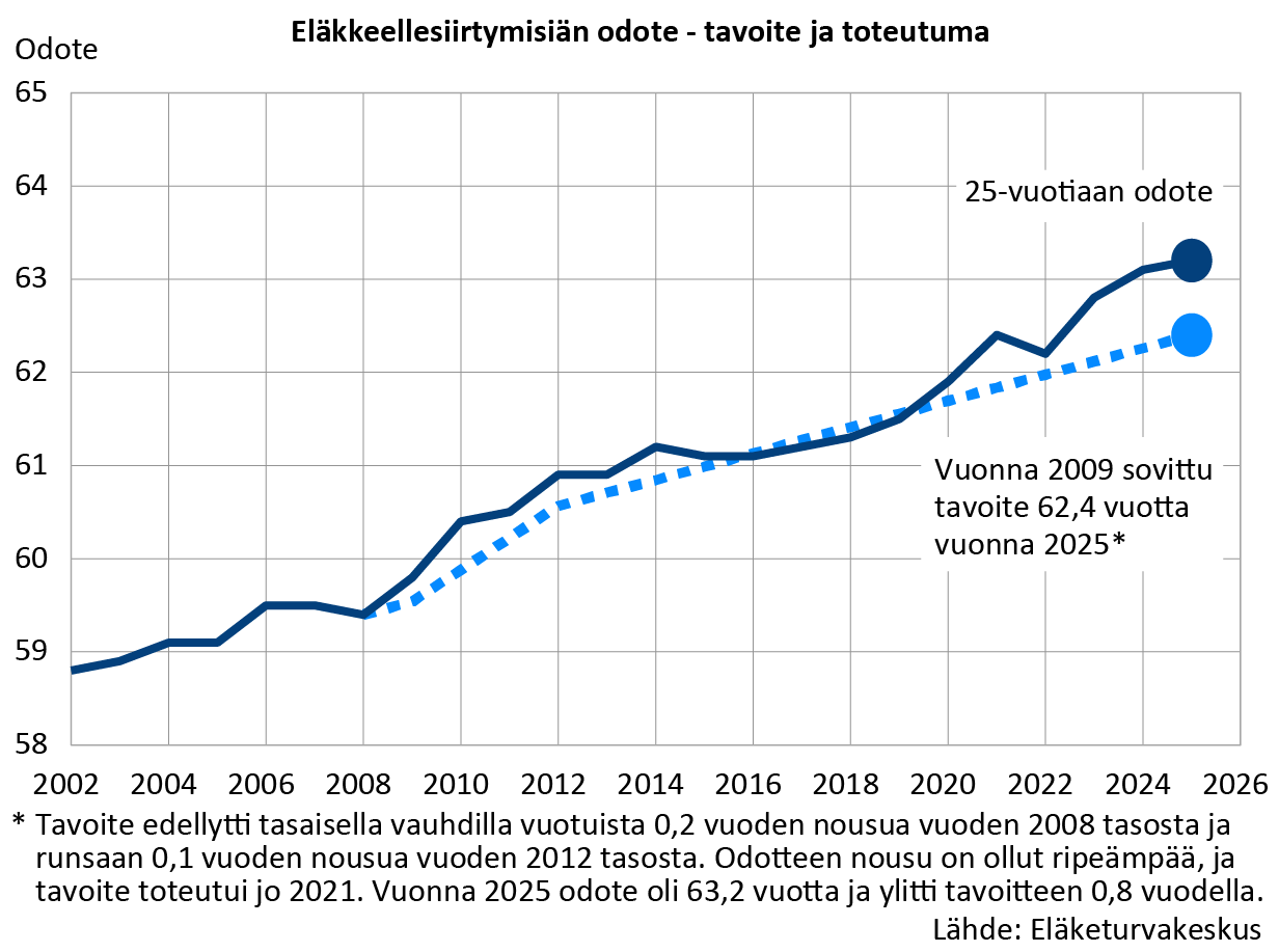 Vuonna 2009 asetettu minimitavoite ehti toteutua jo vuonna 2021, kun eläkkeellesiirtymisiän odote nousi 62,4 vuoteen eli juuri tavoitteen tasolle. Seuraavana vuonna odote kuitenkin notkahti, koska vanhuuseläkkeelle siirtyi poikkeuksellisen moni vakuutettu. Vuosina 2023–2025 vanhuuseläkkeelle siirtyneitä on ollut vähemmän ja heidän keski-ikänsä on vuosi vuodelta noussut, mikä on nostanut eläkkeellesiirtymisikää merkittävästi.