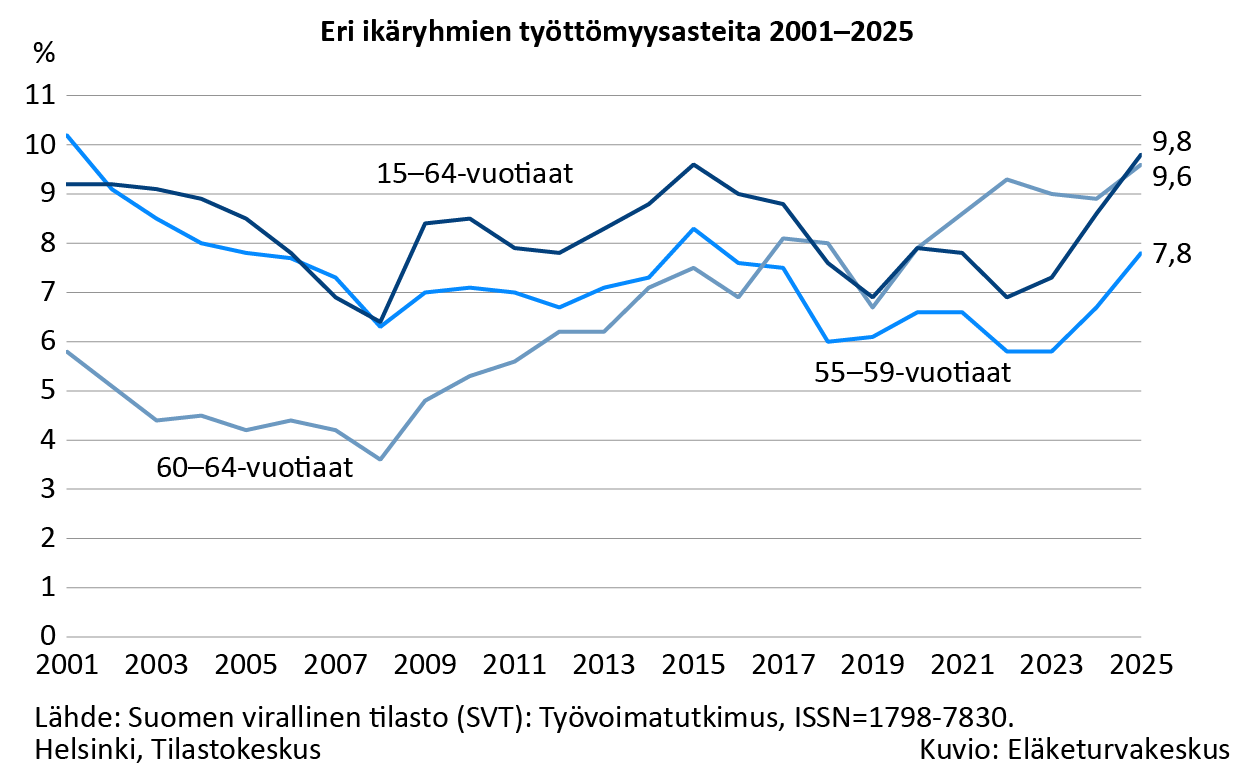 - 55–59-vuotiaiden työttömyysaste seuraa koko työikäisen väestön työttömyysastetta, mutta on selvästi sen alapuolella.