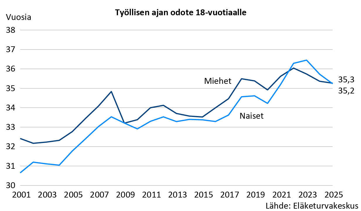 18-vuotiaan työllisen ajan odote oli 35,2 vuotta