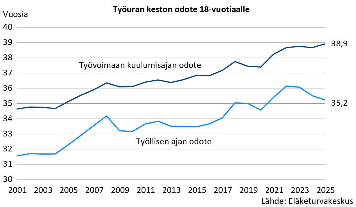 18-vuotiaan työvoimaan kuulumisajan odote oli 38,9 vuotta