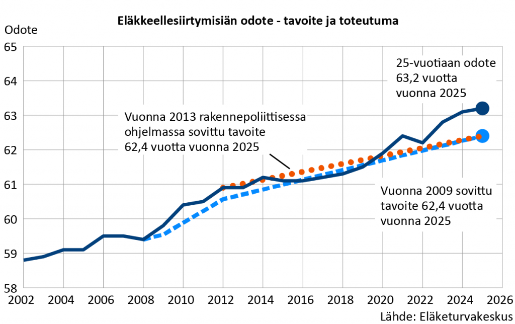 Tavoite on toteutunut ennakoitua paremmin. Eläketurvakeskuksen (ETK) tuoreiden tilastojen mukaan suomalaiset jäävät nyt työeläkkeelle keskimäärin 63,2-vuotiaana. Eläkkeellesiirtymisiän odote on nyt lähes vuoden alun perin tavoiteltua korkeampi.