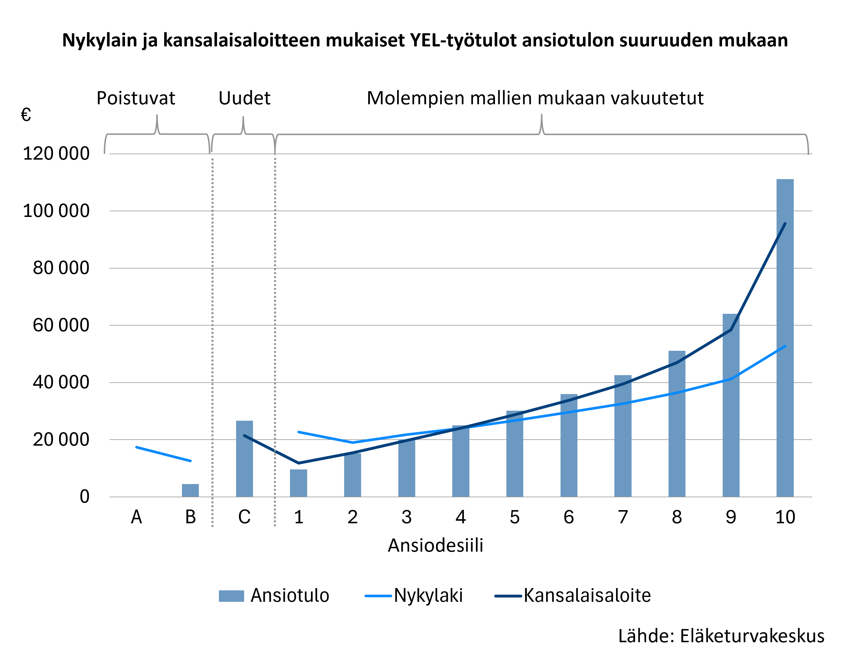 Laskelmat perustuvat vuoden 2024 toteutuneisiin ansiotuloihin ja YEL-työtuloihin. Niissä ei ole huomioitu mahdollisia käyttäytymisvaikutuksia, kuten muutoksia yrittäjien tulonmuodostuksessa tai yhtiömuodoissa.