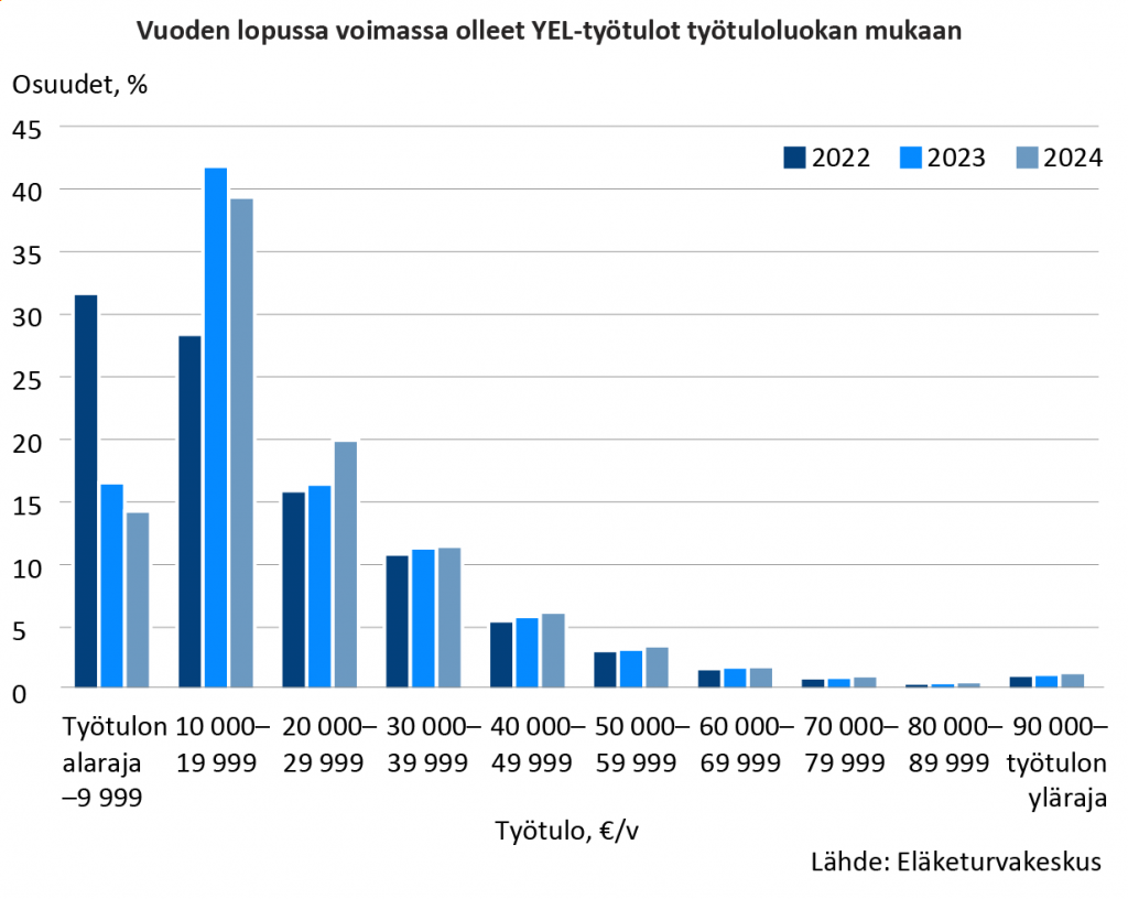 Eläketurvakeskuksen tuoreen tilaston mukaan Suomessa oli vuoden 2024 lopussa YEL-vakuutettuja yrittäjiä hieman yli 212 000. Yrittäjien keskimääräinen vahvistettu työtulo oli lähes 25 000 euroa vuodessa. Keskimäärin työtulot nousivat yli 5 prosenttia, mediaanityötulo yli 10 prosenttia.