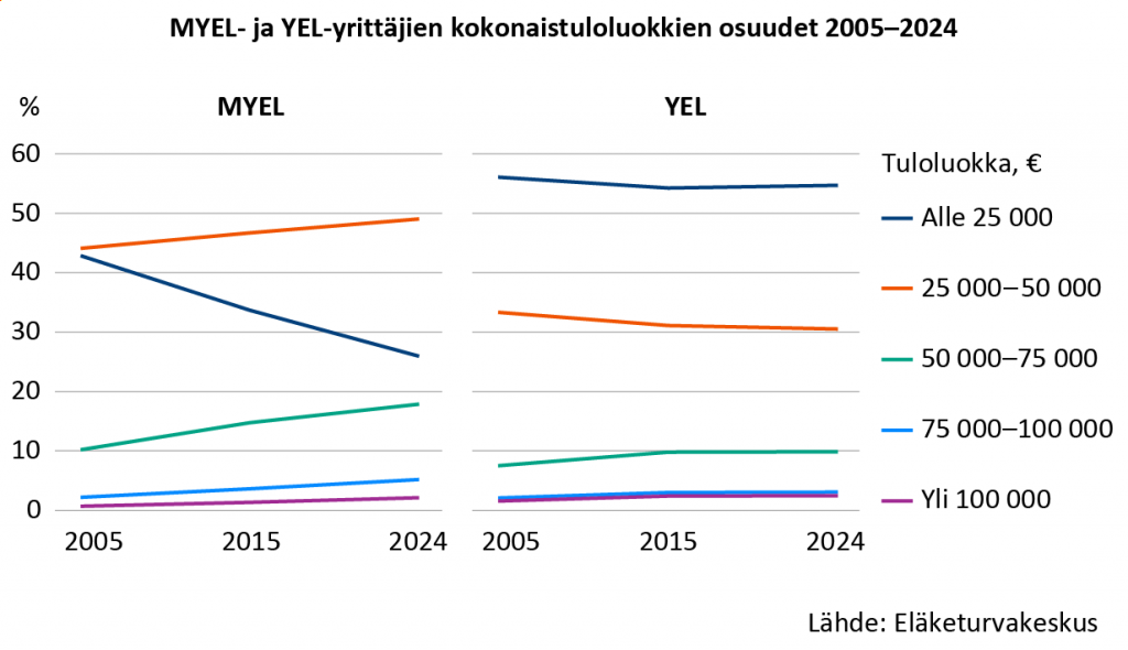 Muutos näkyy myös tuloluokittain. MYEL-yrittäjien joukossa alle 25 000 euroa eläkevakuutettua tuloa omaavien määrä on vähentynyt noin kuudellatoista prosentilla viimeisen kahdenkymmenen vuoden aikana.