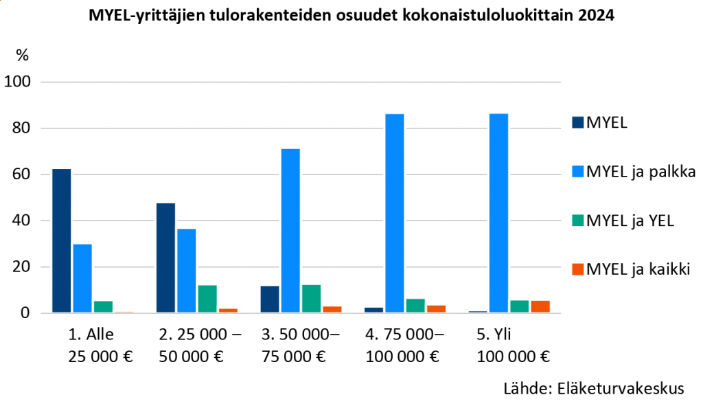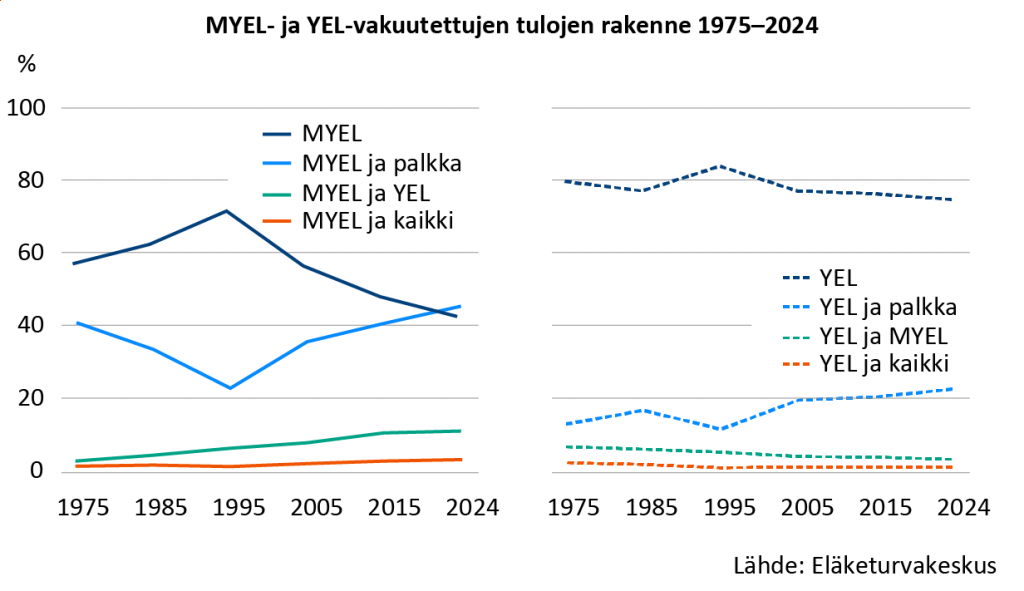 MYEL-yrittäjillä tulot muodostuvat hyvin eri tavalla. Viimeisen 30 vuoden aikana pelkästään MYEL-yrittäjänä toimivien määrä on vähentynyt merkittävästi ja MYEL-yrittäjyyttä palkkatyöhön yhdistävien määrä noussut siten, että tämä ryhmä on jo yleisin MYEL-vakuutettujen joukossa. Tämä kertonee maatalouden voimakkaasta rakennemuutoksesta. Muutos näyttää alkaneen Suomen EU-jäsenyydestä.
