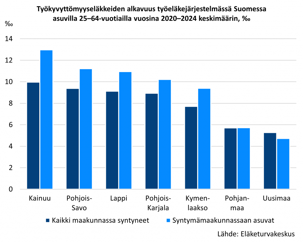 Työkyvyttömyyseläkkeiden alkavuudessa oli vuosina 2020–2024 huomattavia alueellisia eroja henkilön syntymämaakunnan mukaan tarkasteltuna. 25–64-vuotiailla työkyvyttömyyseläkkeiden alkavuus oli selvästi suurempi Pohjois- ja Itä-Suomessa sijaitsevissa maakunnissa syntyneillä kuin Etelä- ja Länsi-Suomessa. Suurin se oli Kainuussa, Pohjois-Savossa, Lapissa ja Pohjois-Karjalassa syntyneillä ja pienin Uudellamaalla ja Pohjanmaalla syntyneillä. Alueelliset erot olivat vielä suurempia syntymämaakunnassaan asuvien välillä.