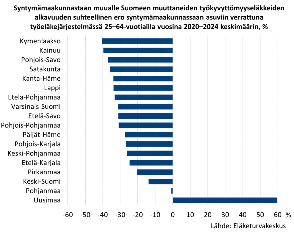 Kun ikärakenne otetaan huomioon, etenkin syntymämaakunnassaan asuvien väliset erot kaventuvat, koska 55–64-vuotiaiden osuus työeläkevakuutetusta väestöstä oli tässä väestöryhmässä suurempi Pohjois- ja Itä-Suomessa kuin Etelä- ja Länsi-Suomessa vuosina 2020–2024. Sen sijaan koulutusrakenteen huomioon ottaminen kaventaa etenkin syntymämaakunnassaan asuvien ja muualle Suomeen muuttaneiden välisiä eroja. Vähintään korkeakouluasteen tutkinnon suorittaneiden osuus oli tarkasteluajanjaksolla syntymämaakunnastaan pois muuttaneilla paljon suurempi kuin syntymämaakunnassaan asuvilla. Uudellamaalla syntyneillä näiden kahden väestöryhmän välillä ei ollut kuitenkaan juuri eroa.