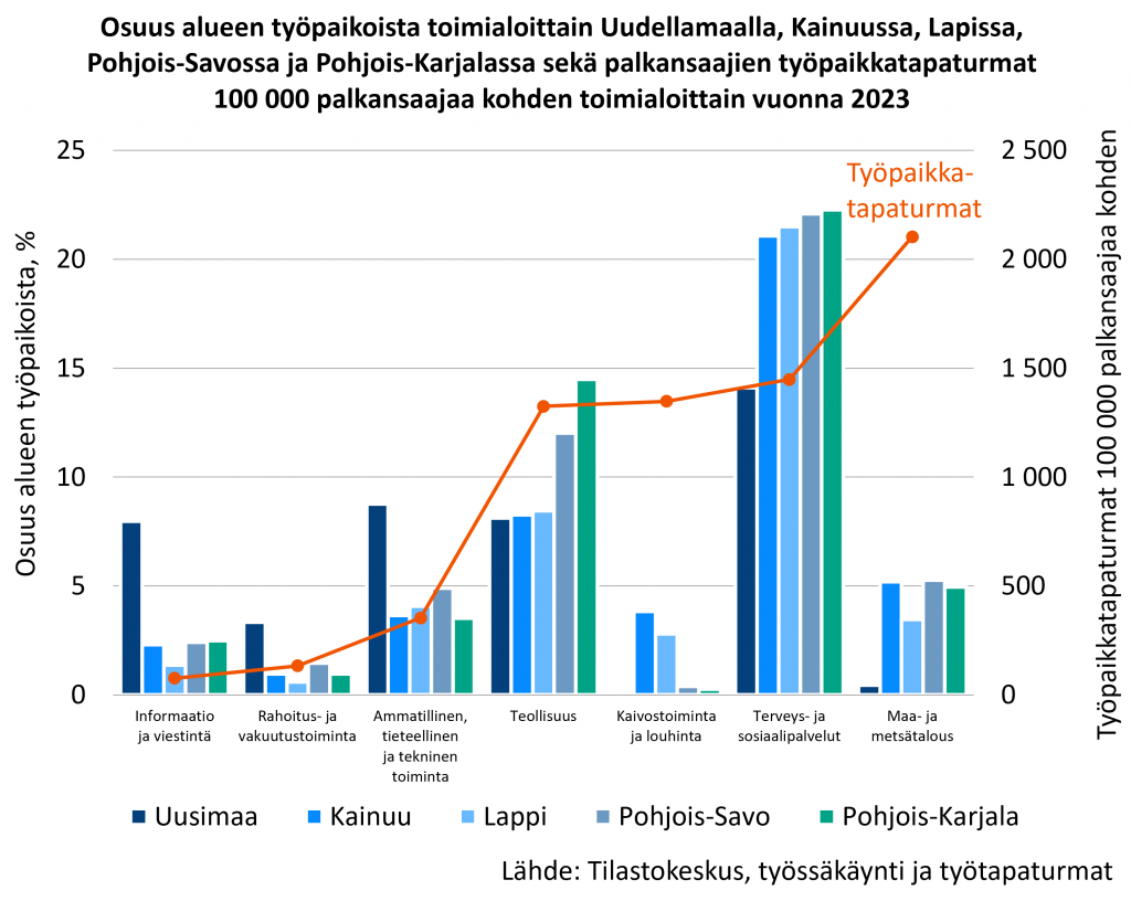 Toimialoittain tarkasteltuna elinkeinorakenteessa on huomattavia alueellisia eroja. Kainuussa, Pohjois-Savossa, Lapissa ja Pohjois-Karjalassa työpaikkojen osuus on Uuteenmaahan verrattuna paljon suurempi fyysisesti raskailla toimialoilla, kuten maa- ja metsätaloudessa sekä terveys- ja sosiaalipalveluissa. Uudellamaalla taas työpaikkojen osuus on paljon suurempi asiantuntijatyyppisillä aloilla, kuten informaatiossa ja viestinnässä sekä ammatillisessa, tieteellisessä ja teknisessä toiminnassa.