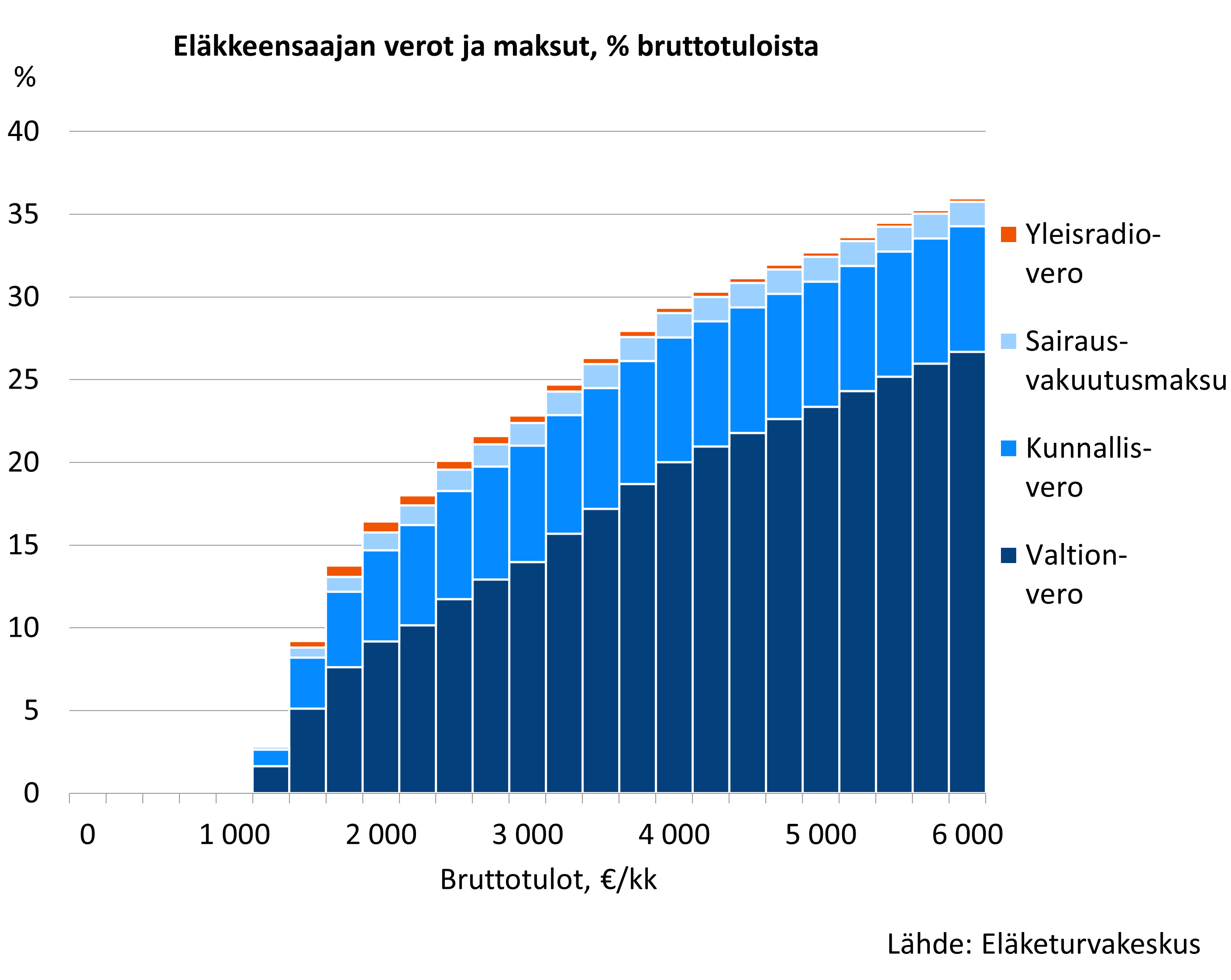 Alla olevassa kuvassa on verrattu palkansaajan ja eläkkeensaajan vero- ja maksurasitetta vuonna 2026 eri tulotasoilla (kuukausitulo on vuositulo/12). Palkansaajan kokonaismaksuprosentti on erilainen eri ikäisillä palkansaajilla, koska palkansaajan maksut muuttuvat iän mukaan. 69-vuotias ei maksa enää palkansaajan maksuja. Ikä vaikuttaa palkansaajien verotukseen myös työtulovähennyksen kautta, koska 65 vuotta täyttänyt saa työtulovähennyksen korotettuna. Noin 1 500 euron tuloista alkaen eläkkeensaajan vero- ja maksuprosentti on pari prosenttiyksikköä korkeampi kuin alle 65-vuotiaalla palkansaajalla. Suurimmillaan ero on 1 800 euron kuukausituloilla 3,5 prosenttiyksikön paikkeilla. Kun tulotaso on yli 5 000 euroa, tasaantuu ero noin yhteen prosenttiyksikköön.