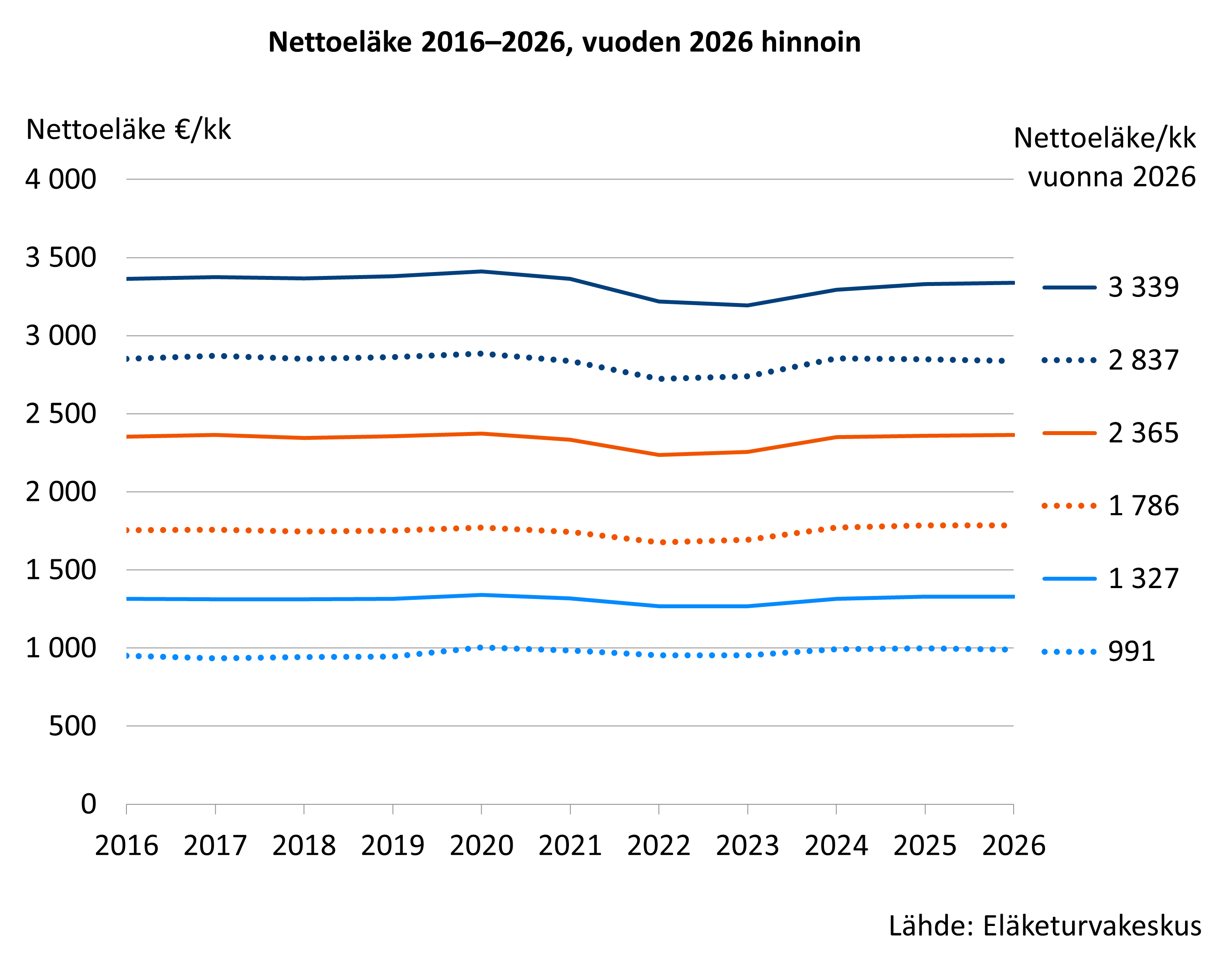 Työeläkkeen, kansaneläke-etuuksien sekä eläkkeiden verotuksen määräytyminen vaikuttavat kaikki osaltaan eläkkeensaajan käteen jäävään nettoeläkkeeseen. Työeläkkeet nousivat työeläkeindeksin mukaisesti noin 0,9 prosenttia vuoden 2026 alussa. Kansaneläkkeen ja takuueläkkeen määrää korotettiin kansaneläkeindeksin mukaisesti 0,5 prosenttia. Eläkkeensaajan asumistuen indeksitarkistukset on jäädytetty vuosille 2024–2027.