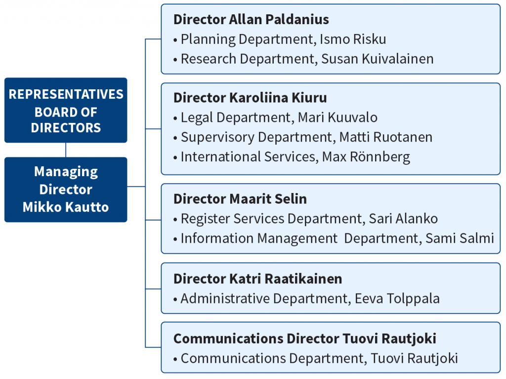 The managing director of the Finnish Centre for pensions is Mikko Kautto. Director Katri Raatikainen (deputy managing director) is in charge of register services and administration. Legal affairs, international pension matters, pension supervision and customer services are the responsibility of director Karoliina Kiuru. Director Allan Paldanius is in charge of research, statistics, planning and information management. Communications director Tuovi Rautjoki is in charge of communications.