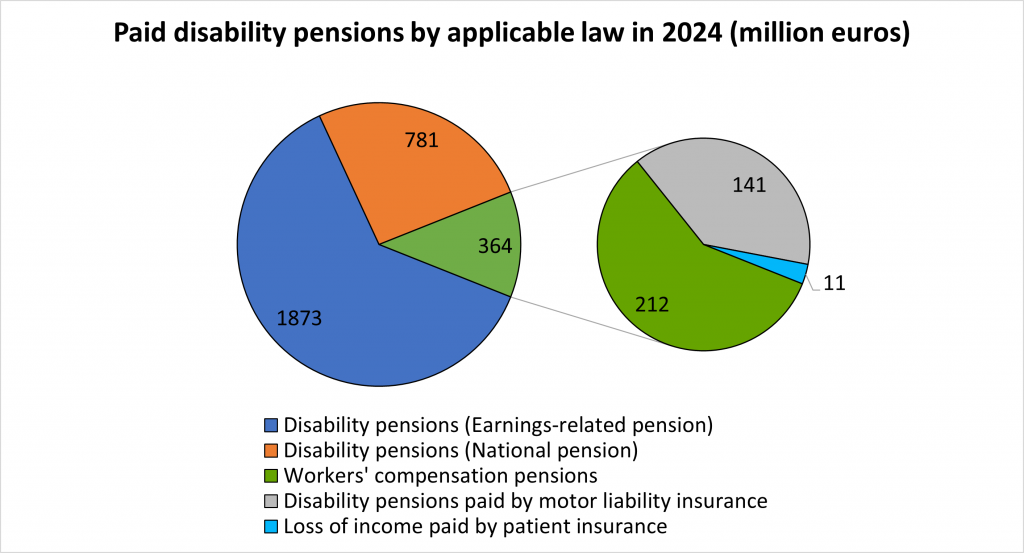 Compensation under LITA insurance is paid out to the amount of around 364 million euros each year. In 2024, compensation paid under the Workers’ Compensation Act amounted to around 212 million euros and under the Motor Liability Insurance Act to around 141 million euros. Disability pensions under the Employees Pensions Act and National pension were paid to the amount of around 2.65 billion euros in 2024.