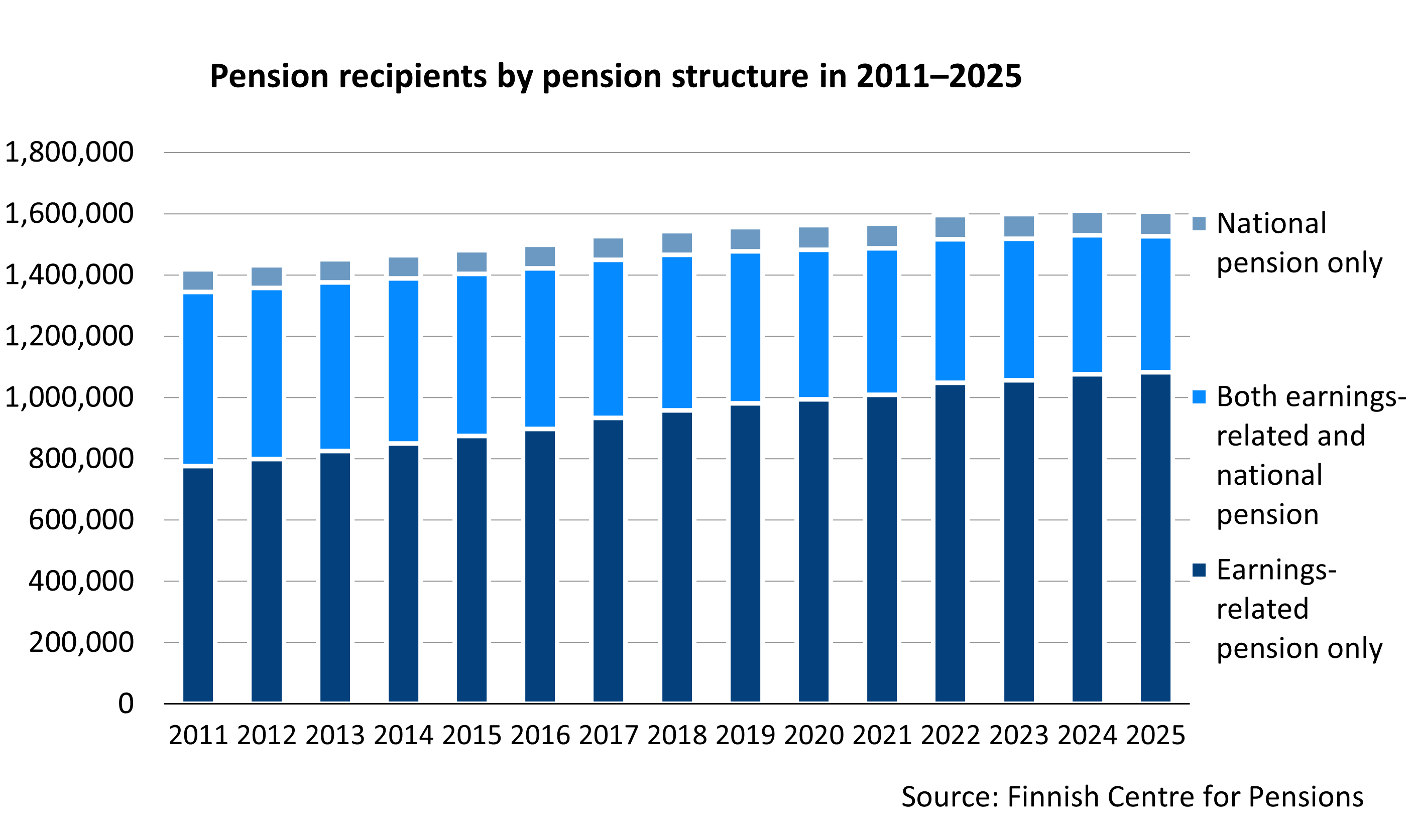 The gradually maturing earnings-related pension system provides a considerable part of pensions. At year-end 2025, around 68 per cent of persons residing in Finland received a pension only under the earnings-related pension system.