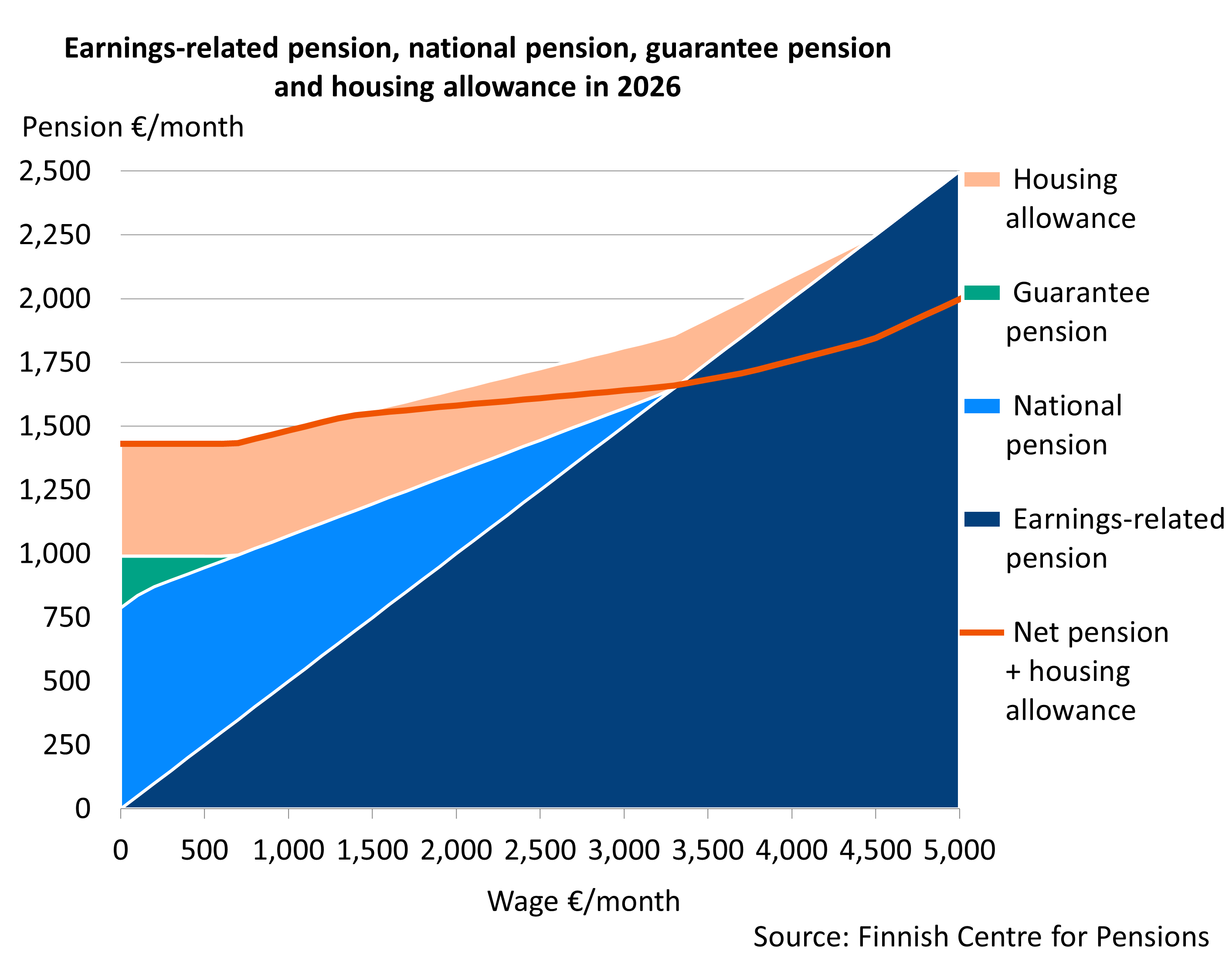 Earnings-related pensions, the national pension and guarantee pension ensure an income in old age and in case of disability and the death of a family breadwinner. Pensions are also paid from, for example, the statutory motor liability and workers’ compensation insurance schemes. The overall pension may include private, voluntary pensions or occupational pensions paid for by the employer. Statutory pensions are taxable income.