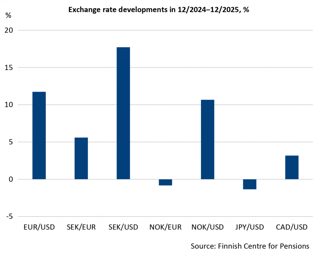 The currency development in 2025 was defined by the weakening of the dollar, especially against the Swedish krona and the euro. For Swedish entities, the home currency strengthened by about 18 percent against the dollar. The euro also strengthened almost 12 percent against the dollar. The dollar also weakened clearly against the Norwegian krone. These currency changes, therefore, fundamentally weakened the returns of dollar-denominated investments for entities in these countries.