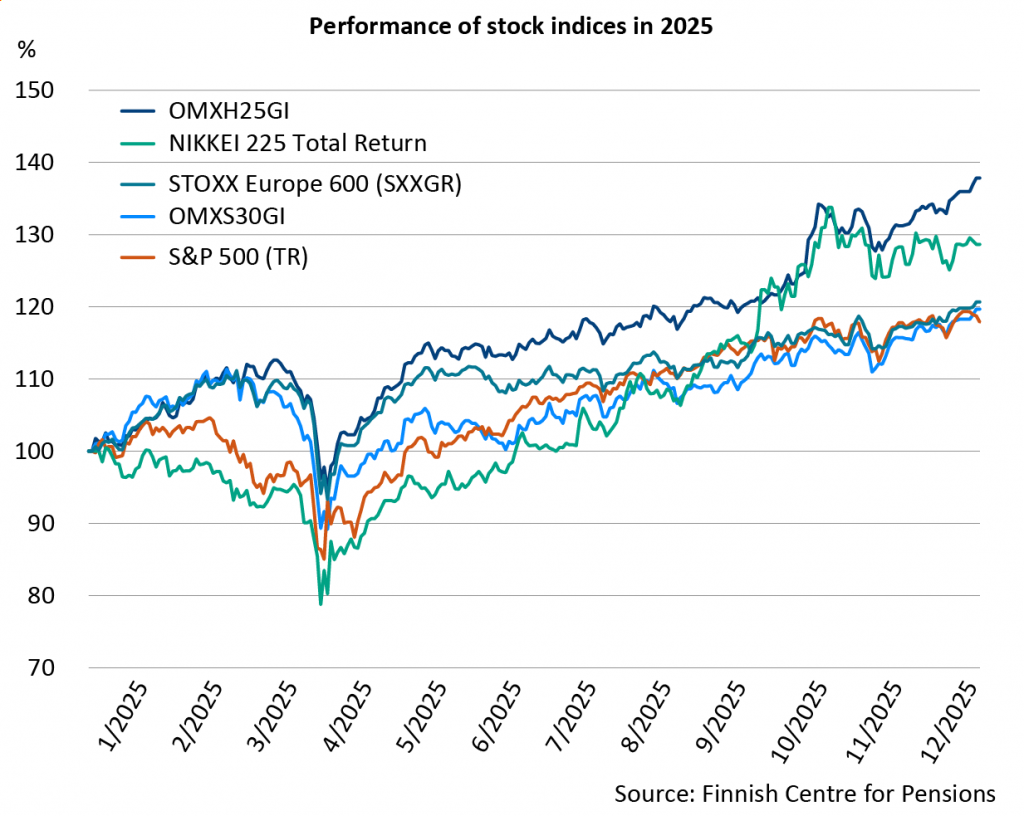 Stock market development across all economic areas was generally upward during 2025. The Helsinki Stock Exchange’s return was particularly strong compared to 2024. From the start of 2025 to the end of the year, the total return of the OMXH25GI index was nearly 40 percent. During the same period, European stocks (STOXX Europe 600) and Stockholm Stock Exchange stocks (OMXS30GI) returned about 20 percent. In Japan, the N225TR index rose nearly 30 percent during the year, and in the United States, the S&P500TR rose 18 percent.