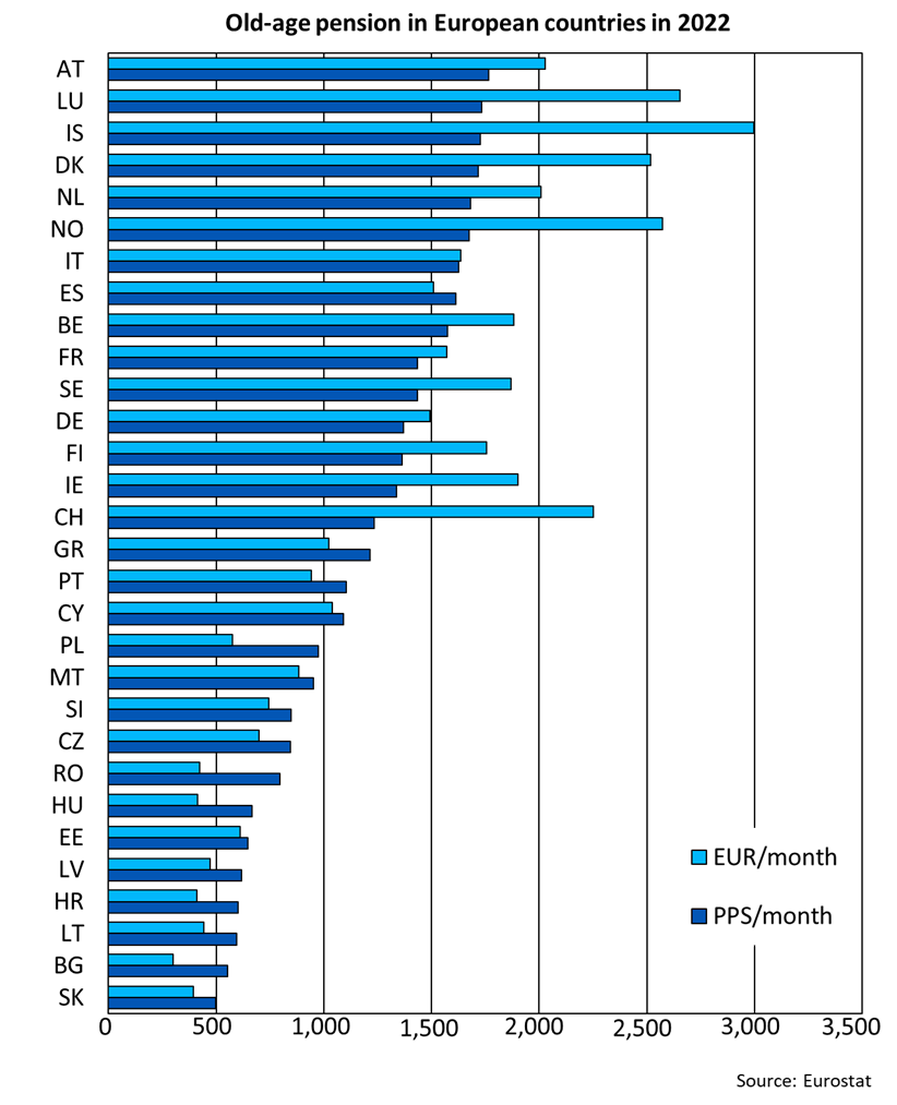 The figures have been calculated from Eurostat’s database by dividing old-age pension expenditure by the number of old-age pension recipients. Due to the calculation and statistical method, the data may differ from the national data on average pensions.