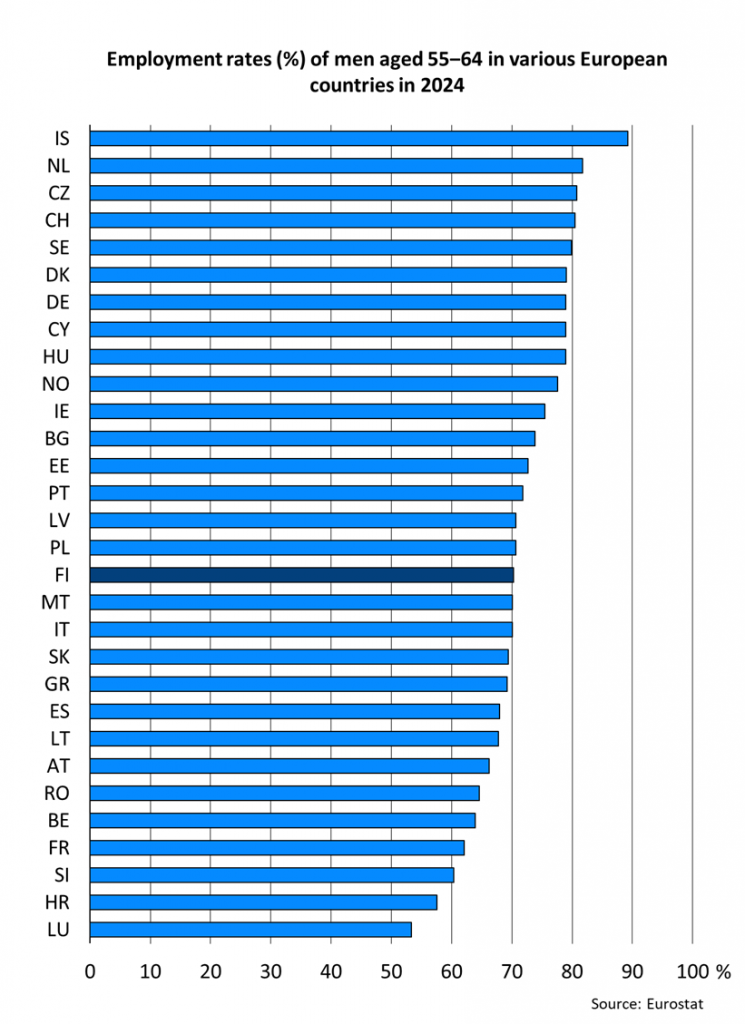 The employment rate of Finnish men aged 55–64 (70.3%) was lower than the EU27 average (71.4%) in 2024. Employment rates for men were above the EU27 average in all other Nordic countries.