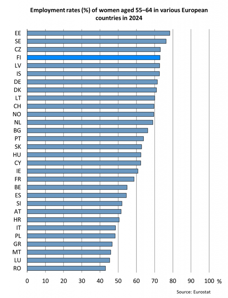 The employment rate of Finnish women aged 55–64 is higher than in many other European countries. In 2024, the employment rate of Finnish women (73%) was significantly higher than the average of EU27 countries (59.3%), as was the case in the other Nordic countries. Additionally, the employment rate of women in this age group in Finland is higher than that of men, which is quite rare across Europe.