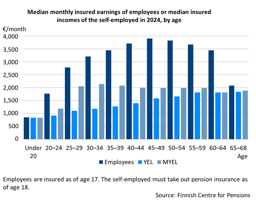 For employees, earnings from all work covered by an earnings-related pension act are included in pensionable earnings, including those from irregular work that may be short-term or part-time. In these statistics, the insured incomes of self-employed persons also include any supplementary and reduced earnings-related pension contributions paid. Farmers and recipients of science and arts grants are covered by MYEL.