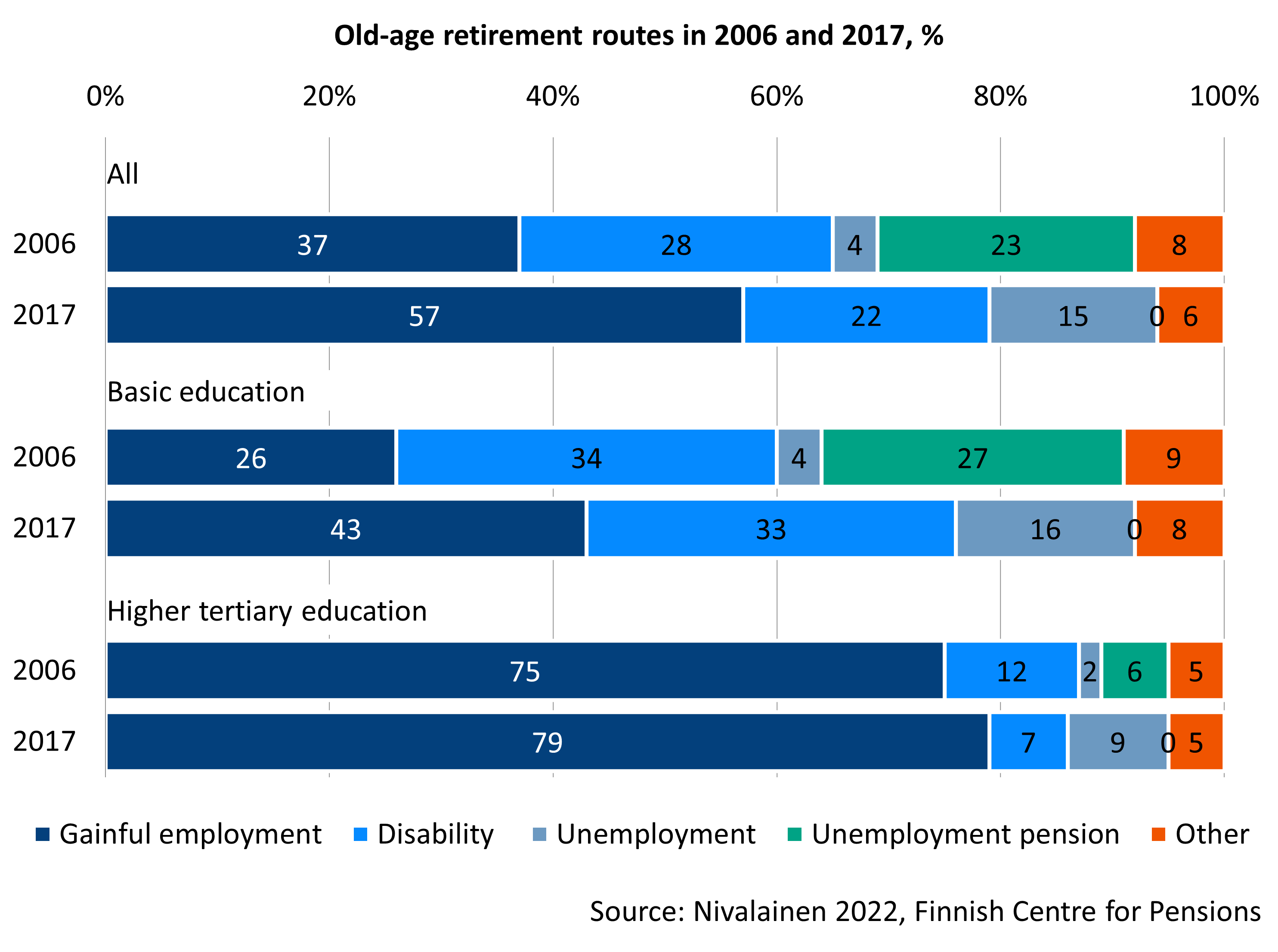 The share of persons retiring on an old-age pension from work grew because of the 2005 pension reform. In 2017, nearly 60 per cent retired on an old-age pension from employment. In 2006, the equivalent proportion was slightly under 40 per cent. There are no major gender gaps in the routes to retirement.