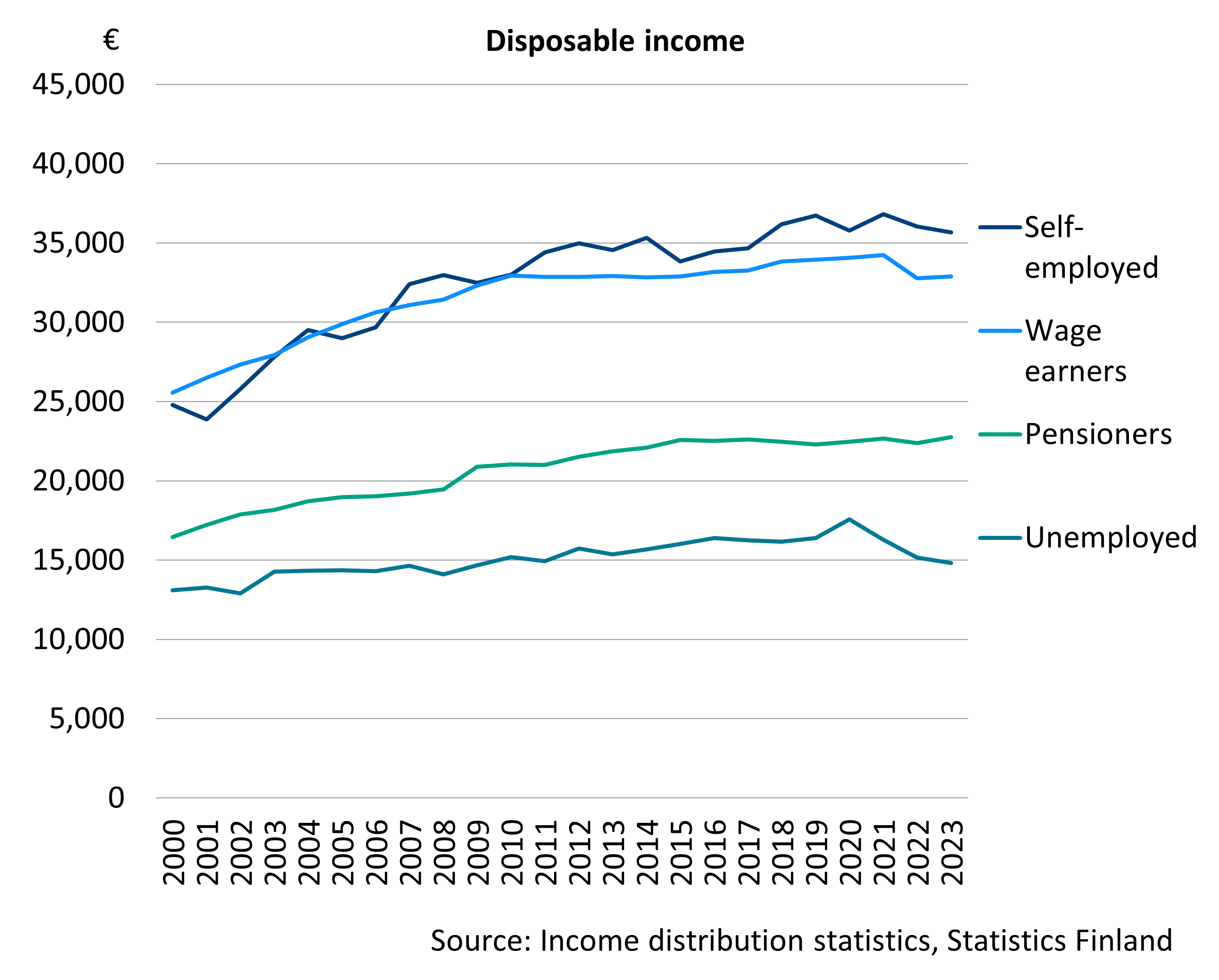 Pensioners’ disposable income is lower than that of wage-earners and the self-employed, but higher than that of the unemployed. Throughout the 2000s, pensioners’ disposable income has been around two thirds of wage-earners’ income. This difference has remained stable in the last few decades. Compared to the income of the unemployed, the income of pensioners has been an ample one third higher in the 2000s.