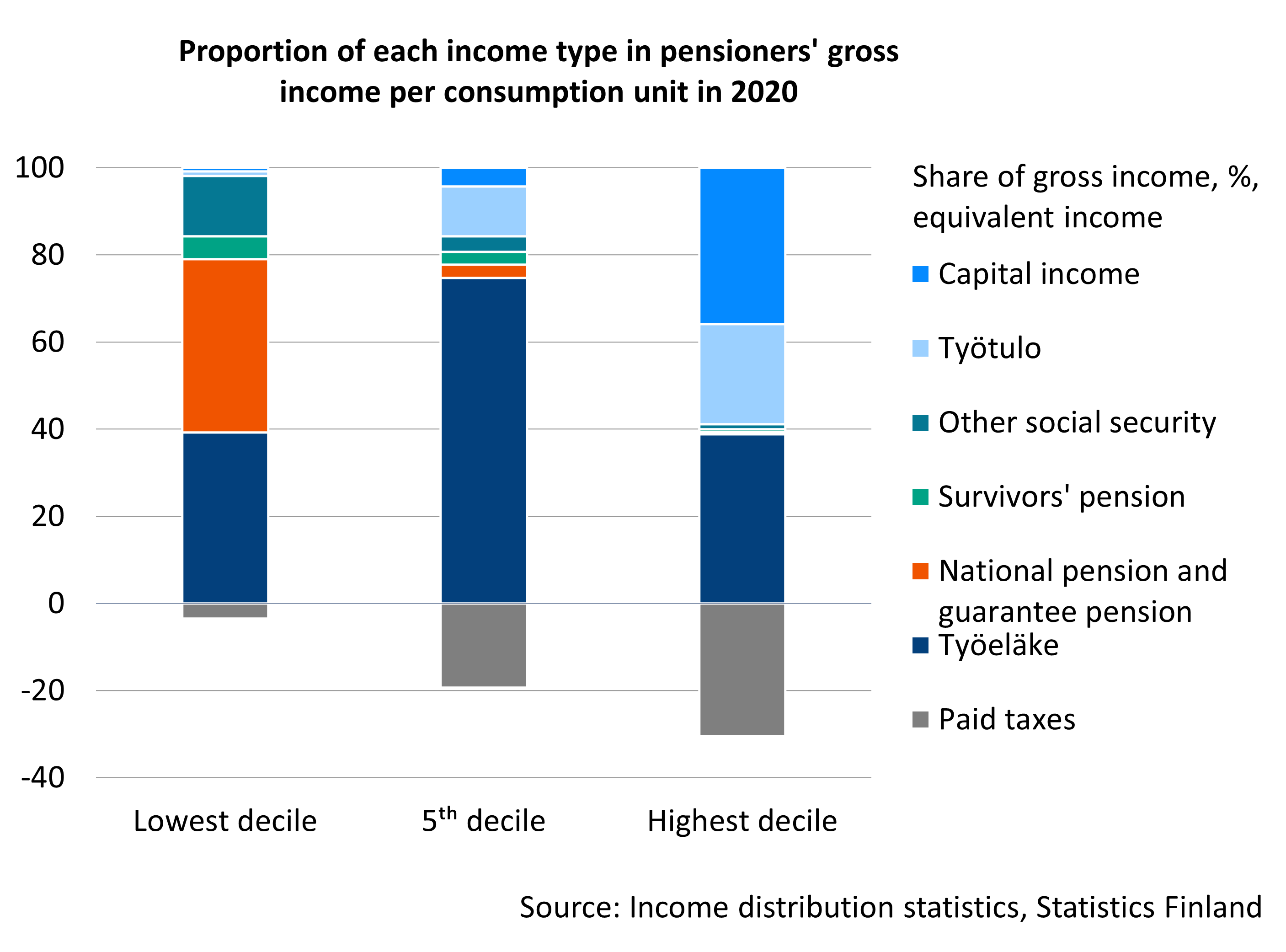 The main source of income for pensioner households is pensions, particularly earnings-related pensions. For instance, in 2020, earnings-related pensions accounted for around three-quarters of the gross income of a typical pensioner. Overall, statutory pension benefits (including earnings-related pensions, national pensions, the guarantee pension, and survivors’ pensions) made up roughly 80 per cent of the gross income in pensioner households.