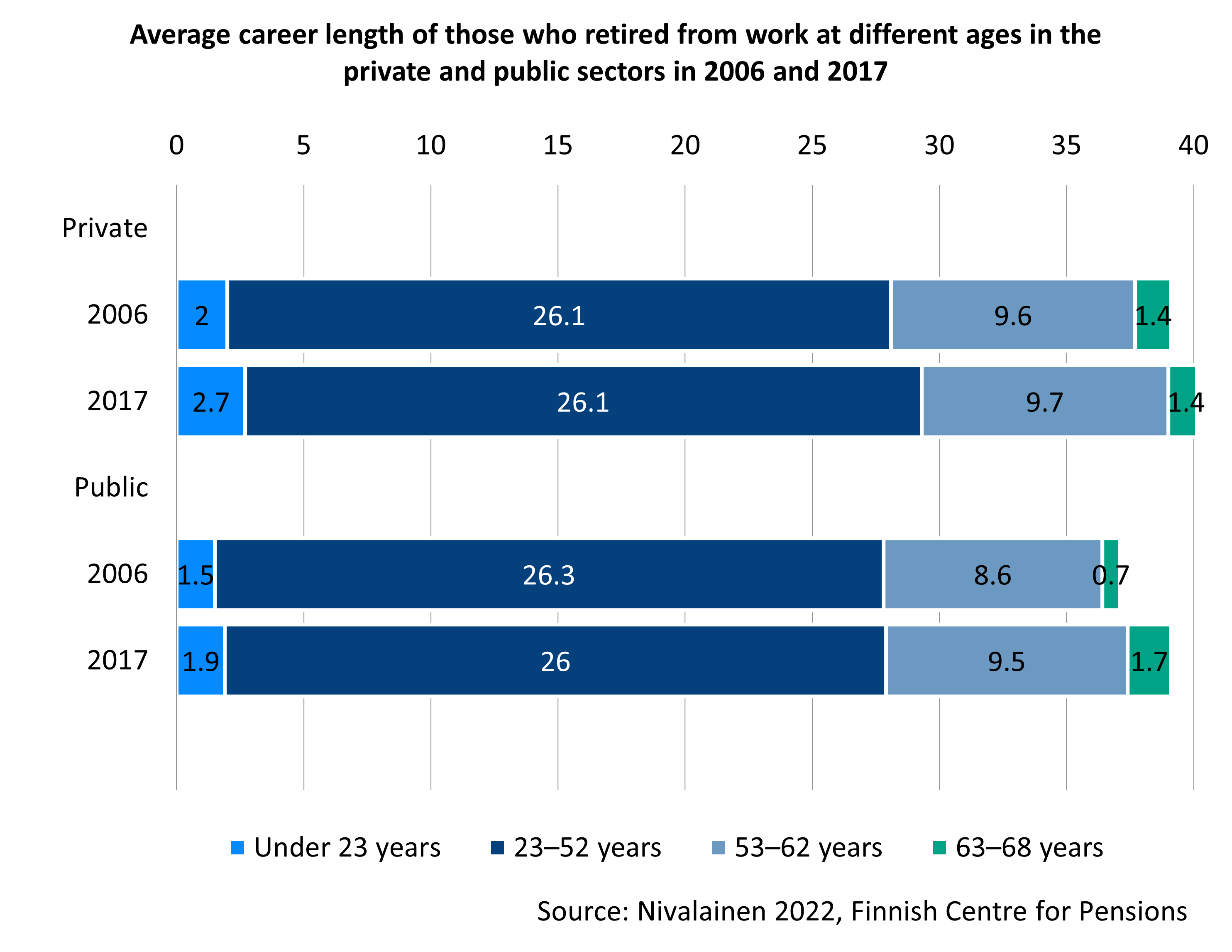 In the private sector, the working careers for those who have retired on an old-age pension from work are longer than in the public sector, but the gap has narrowed. This is largely due to the average retirement age in the public sector rising significantly between 2006 and 2017, whereas there was no increase in the private sector.