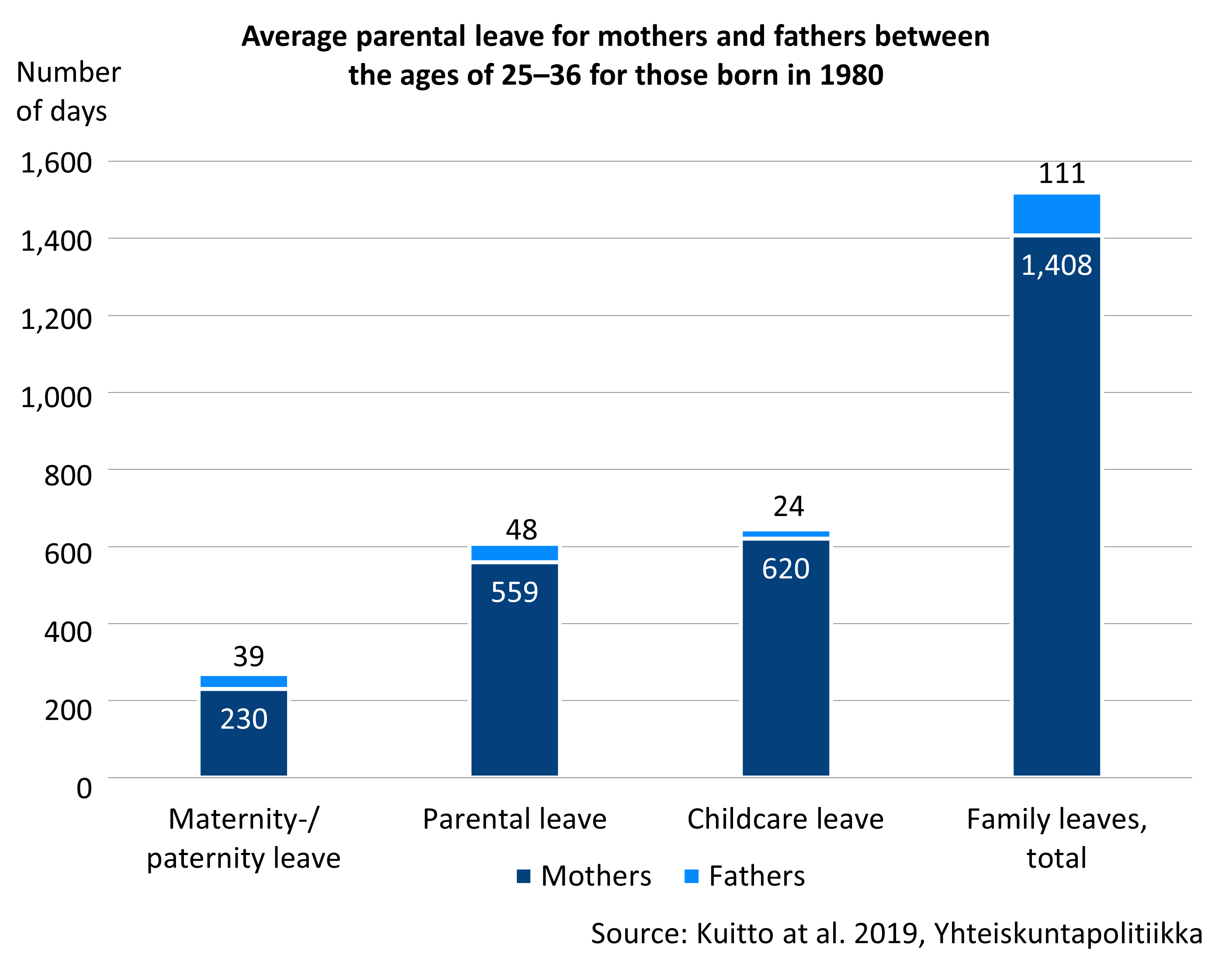 Career breaks due to family leave are significantly longer for women than for men. Mothers born in 1980 took 13 times more days of family leaves than fathers. Long periods of child home care allowance, especially for mothers in lower socio-economic groups, are a unique feature of Finnish family policy in European comparison.