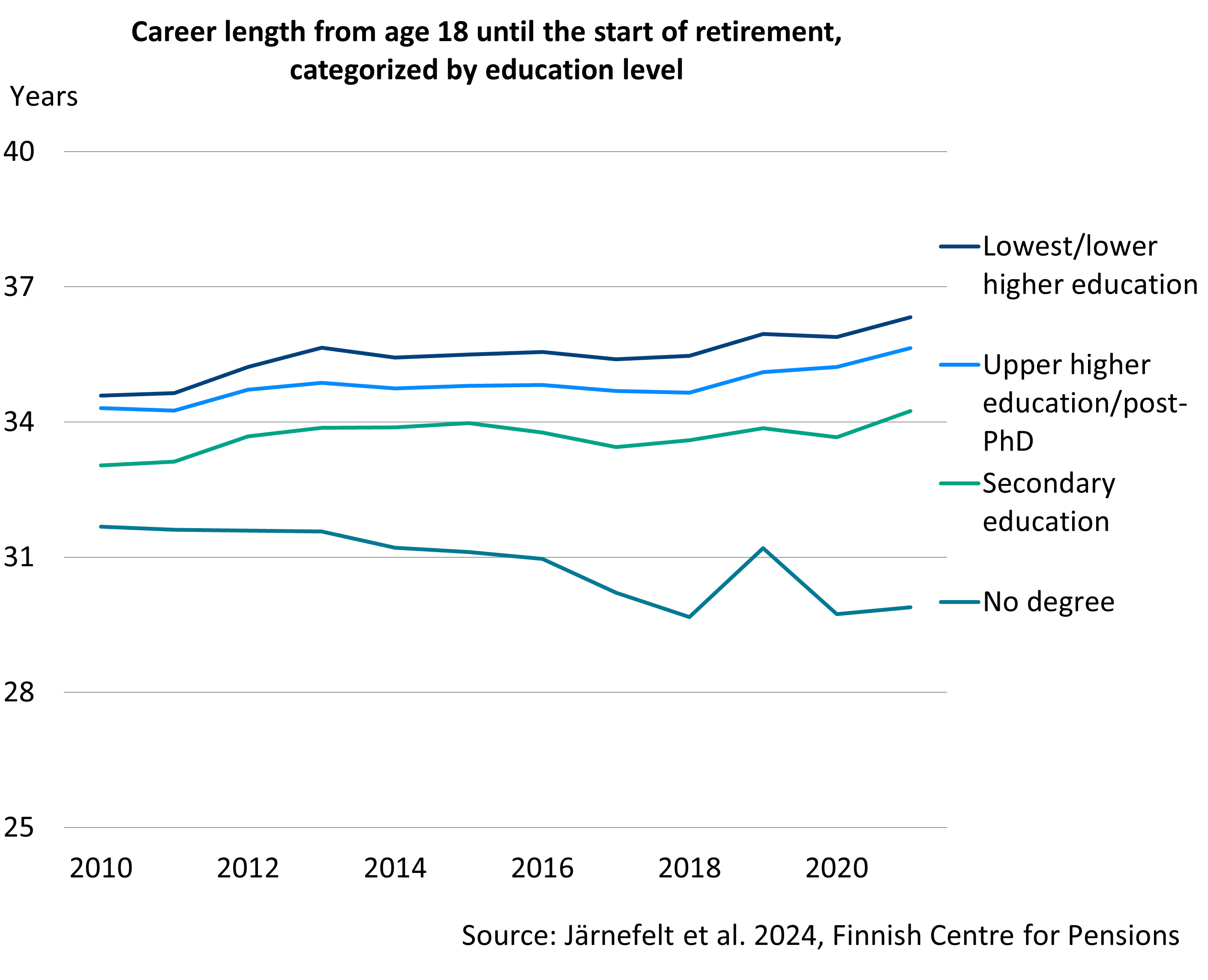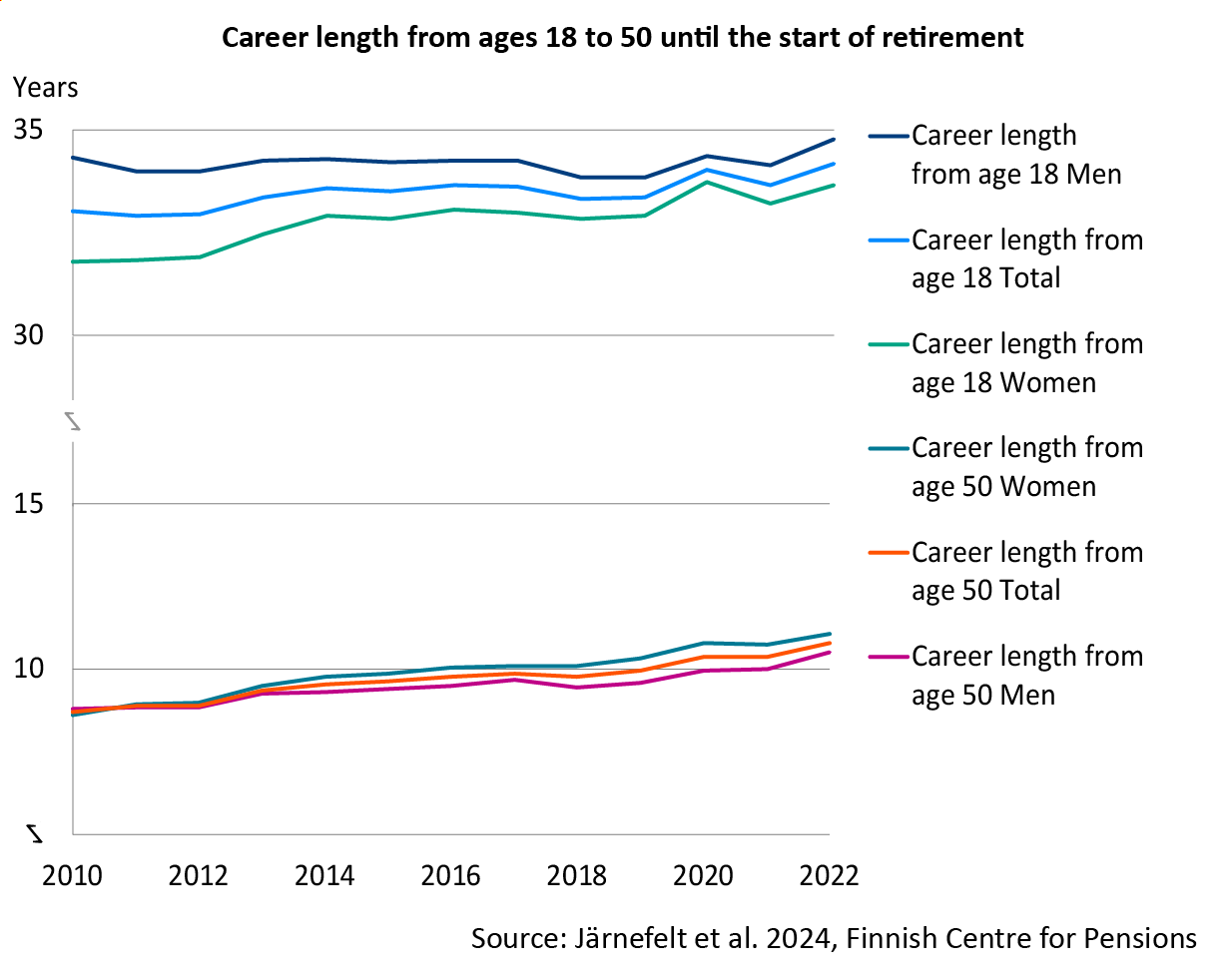 The Finnish Centre for Pensions measures actual working careers based on pension-insured employment, meaning work for which pension contributions have been paid. These are also referred to as gainful careers. It depicts an accumulated career over decades, from as far back as 1962. The Finnish Centre for Pensions measures the working career until the start of the old-age pension, so the gainful career does not include work done alongside receiving the old-age pension.