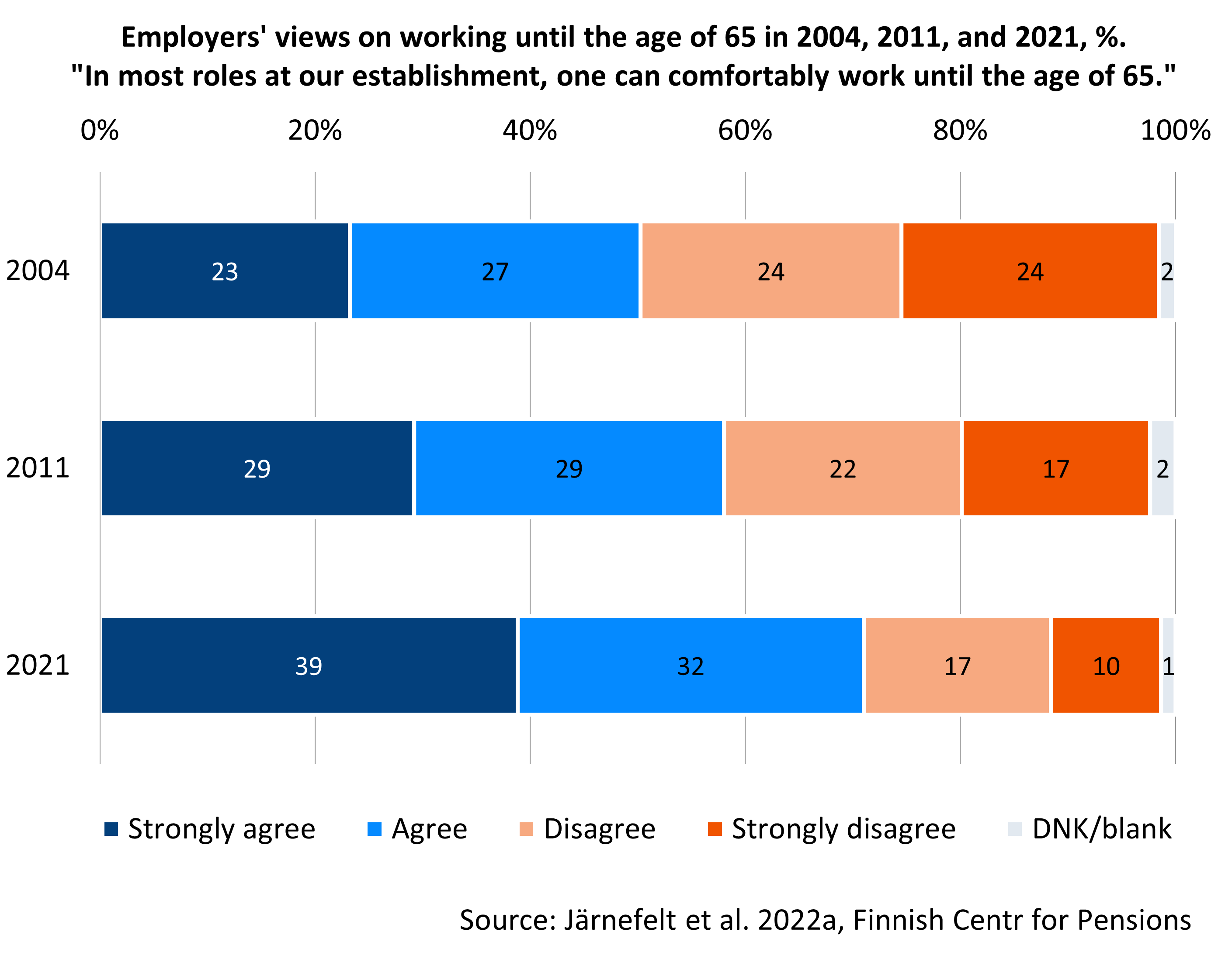 - Järnefelt et al. 2022. Employer’s views on retirement age and extending working lives. Results of employer survey in 2004, 2011 and 2021. (Julkari)