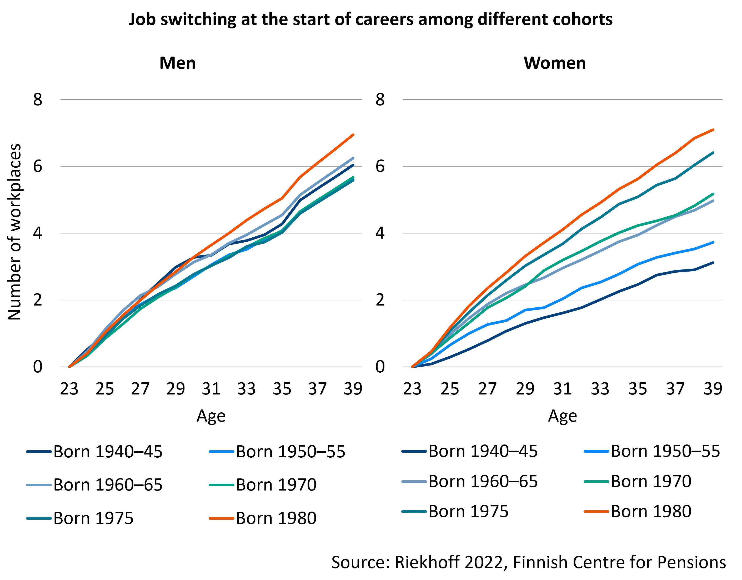 Another dimension of career stability is the frequency with which people change jobs. Since the 1970s, there has been an increase in job changes in the early stages of working careers, especially among women. This change can be voluntary or involuntary. For women, job changes have increased when comparing the cohorts born between 1940 and 1980, while for men, job changes between the ages of 20 and 30 have been almost equally frequent across all age groups.