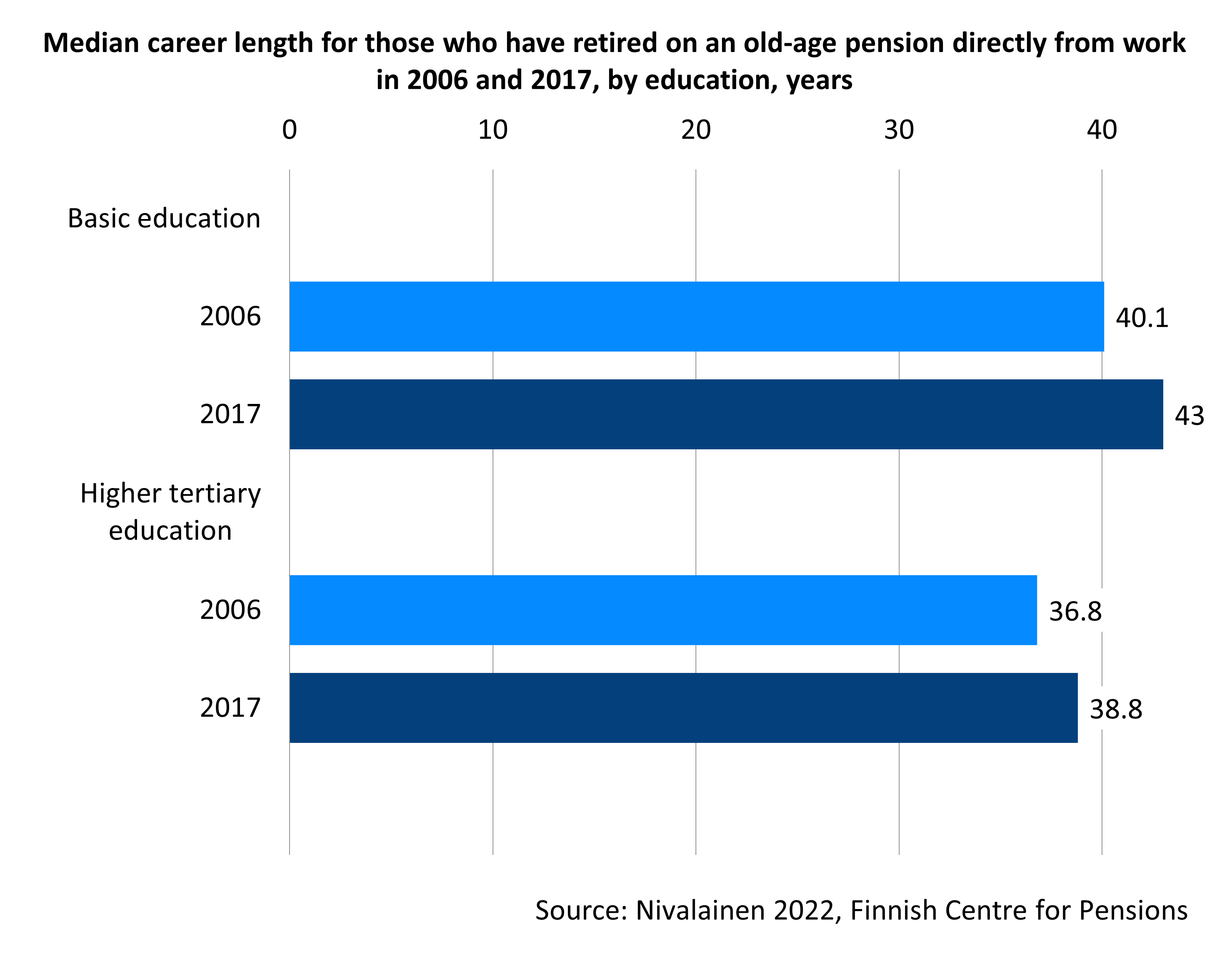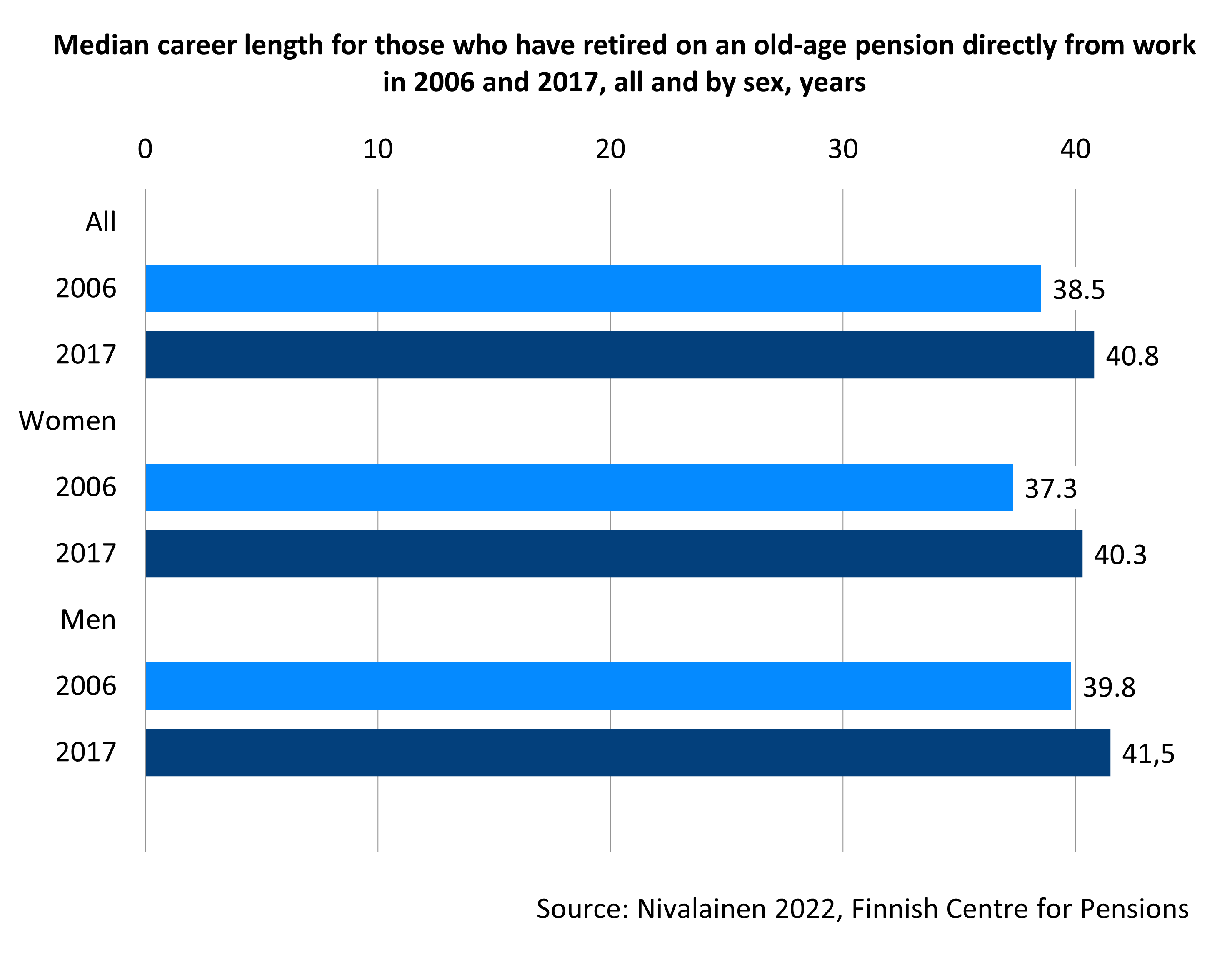 The median length of working careers has increased for those who have retired on an old-age pension directly from work. They had a median career length of almost 41 years in 2017, which is over two years longer than in 2006.