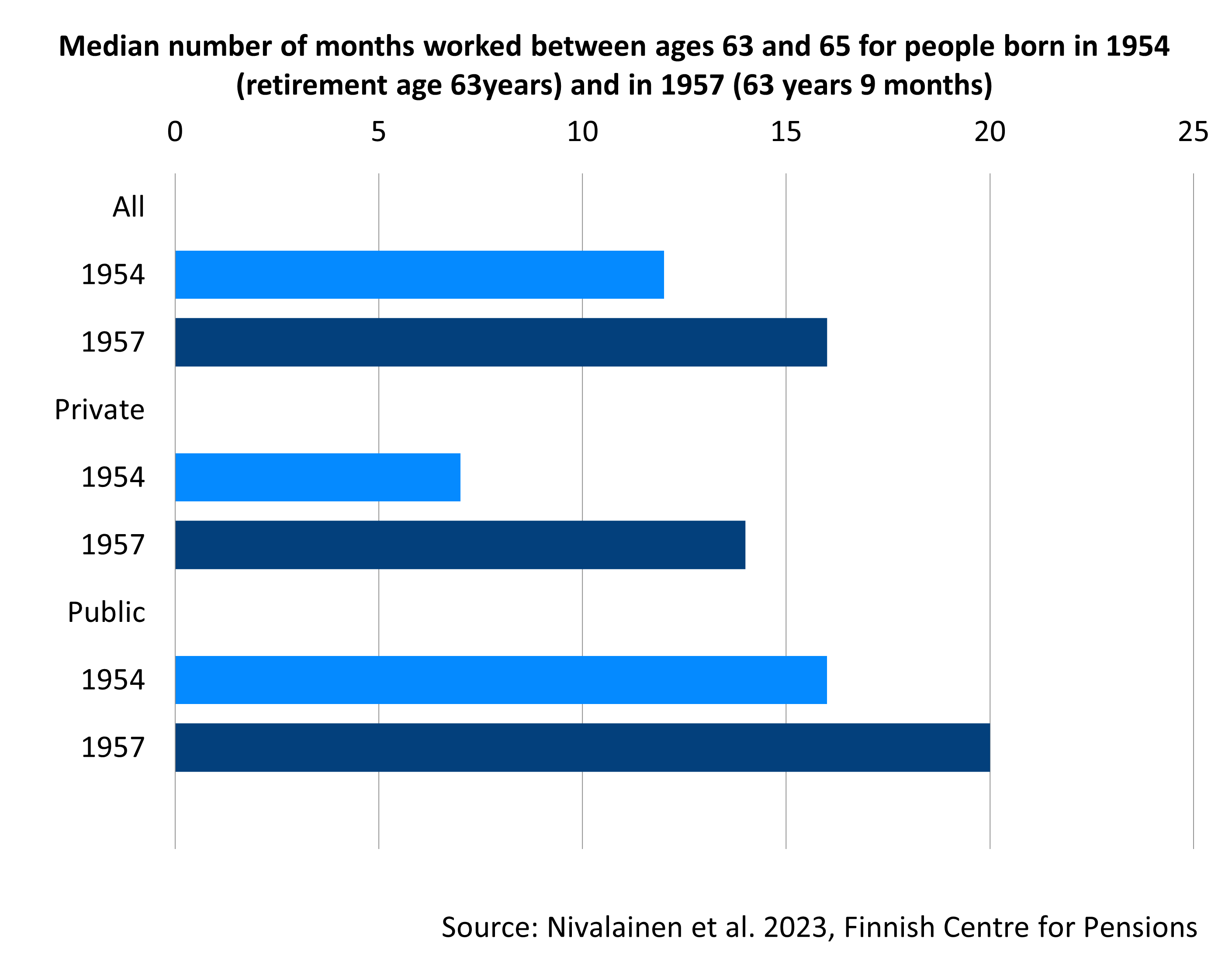 As part of the 2017 pension reform, it was agreed that the retirement age would be gradually increased, one cohort at a time. As a result of this reform, the transition from work to retirement on an old-age pension has been deferred. Consequently, the working careers of those who have continued to work until their retirement age have been extended. Those born in 1957, whose retirement age was 9 months higher than for those born in 1954, worked four months longer between the ages of 63 and 65 than those born in 1954. Thus, the working career length has not increased as much as the retirement age has risen.
