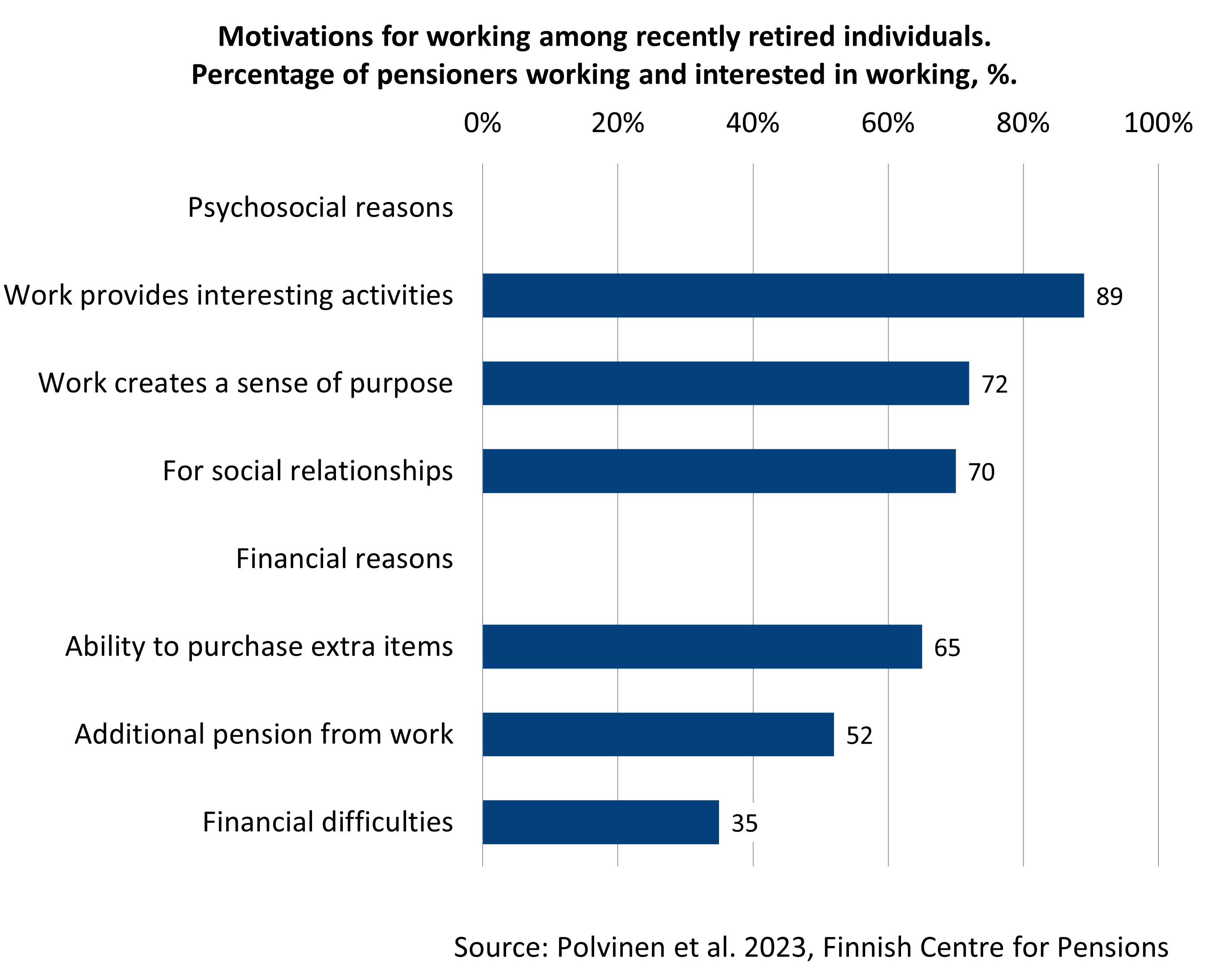 Retirees often want to work because it provides interesting activities and a sense of purpose. Social relationships and financial factors also play a role. Many choose to work in retirement to be able to make additional purchases. One third of pensioners work because of financial difficulties.