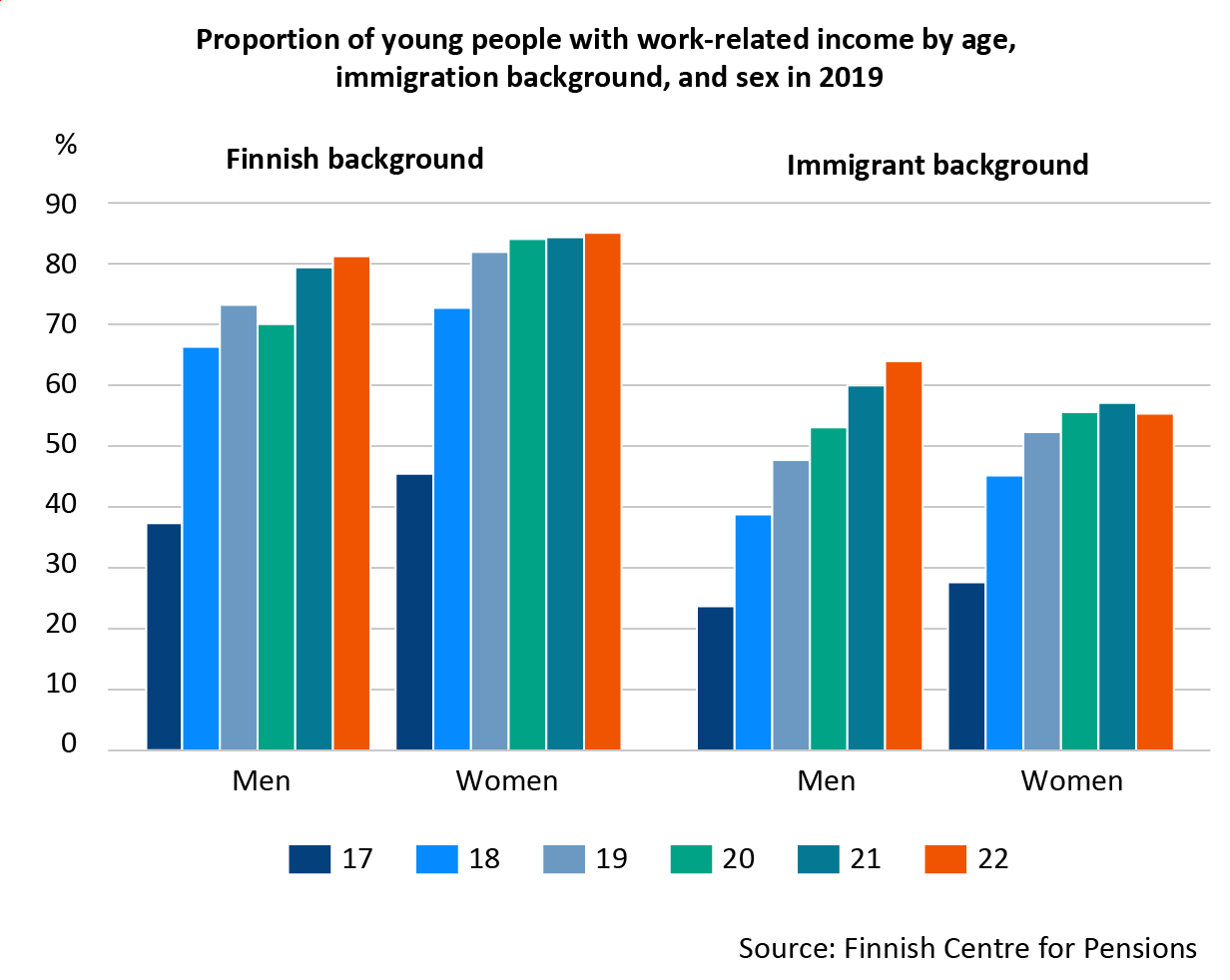 Young people with a migrant background are less likely to work than those with a Finnish background. Differences in employment and earnings between those with a migrant background and those with a Finnish background are already apparent in the early stages of their working careers. For men, these differences in employment rates decrease somewhat with age, but for women there is little change.