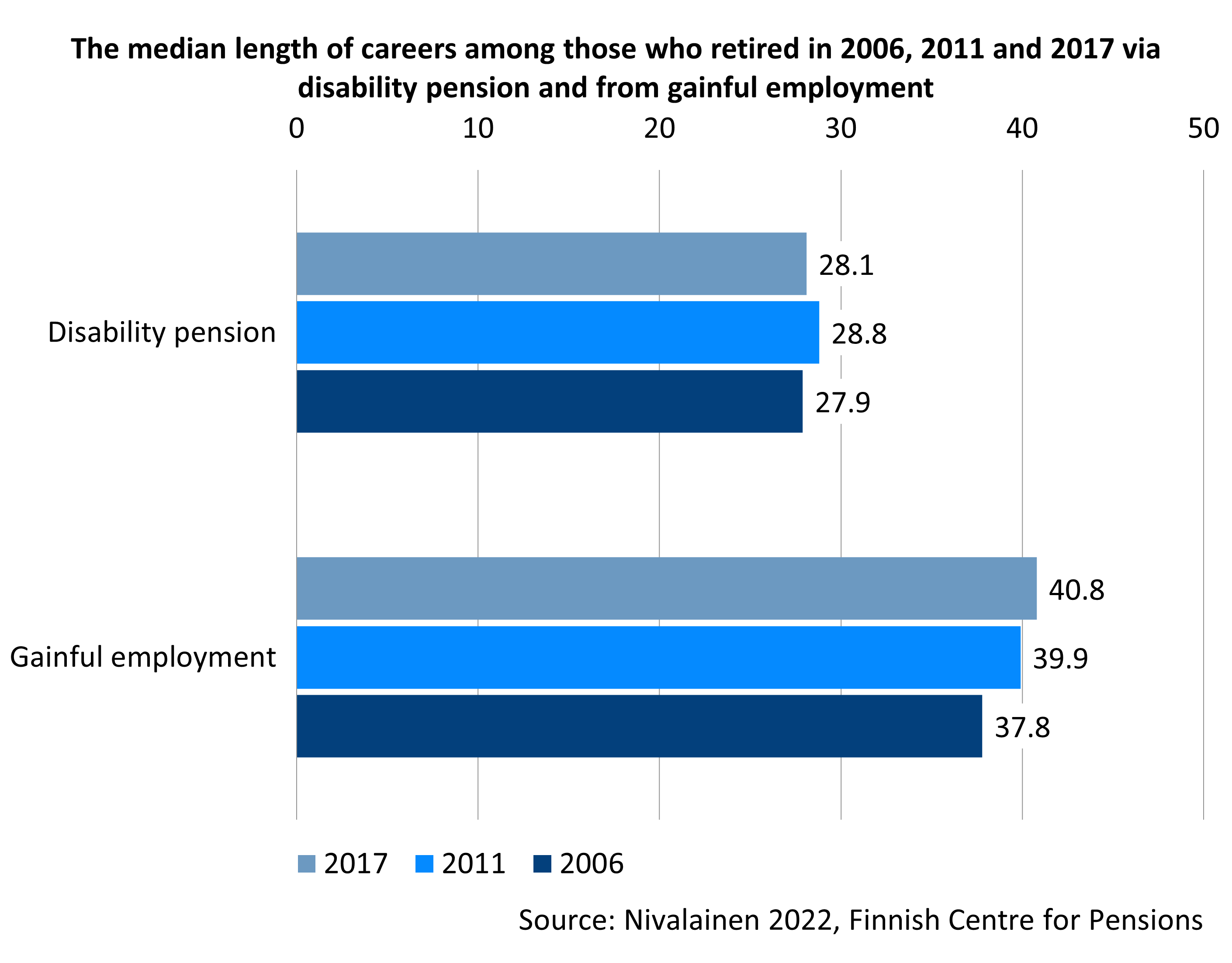 Retirement on a disability pension shortens working careers. In 2017, those who retired via a disability pension had a median career length of 28.1 years, compared with 40.8 years for those who retired directly from work. Between 2006 and 2017, there was little change in the career length of those who transitioned from a disability pension to an old-age pension.