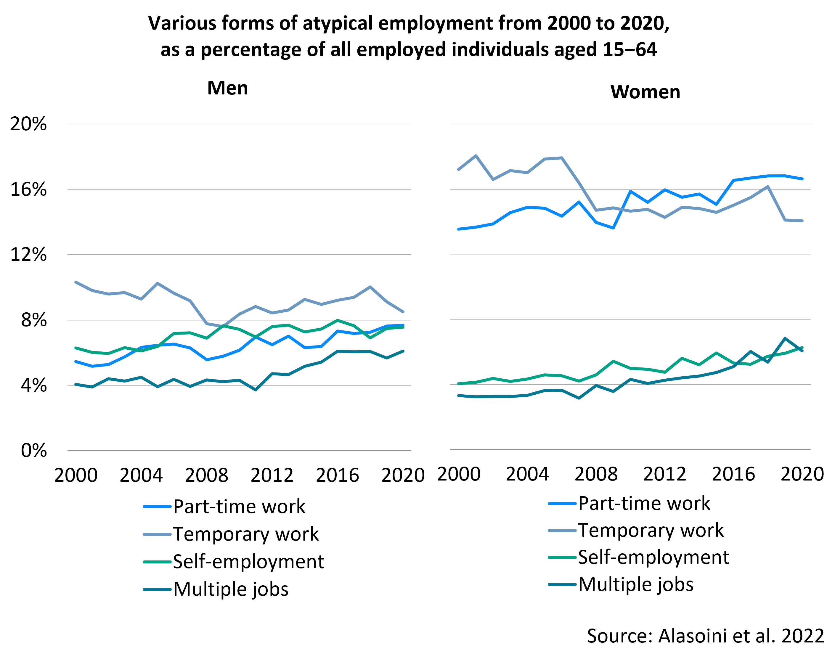 Atypical work refers to work that differs from a full-time permanent job. Among people of working age, part-time and temporary jobs are more common for women than for men: in 2020, around 8 per cent of men had a part-time job and 8 per cent had a temporary job, while for women these figures were around 17 and 14 per cent respectively. The proportions of both part-time and temporary employment have remained relatively stable since the early 2000s, although part-time contracts have increased recently. Temporary contracts are more common in Finland than in other Nordic countries, while part-time work is less common. Other forms of atypical work, such as self-employment, combining two or more jobs and working through temporary employment agencies, have become more common in recent years.
