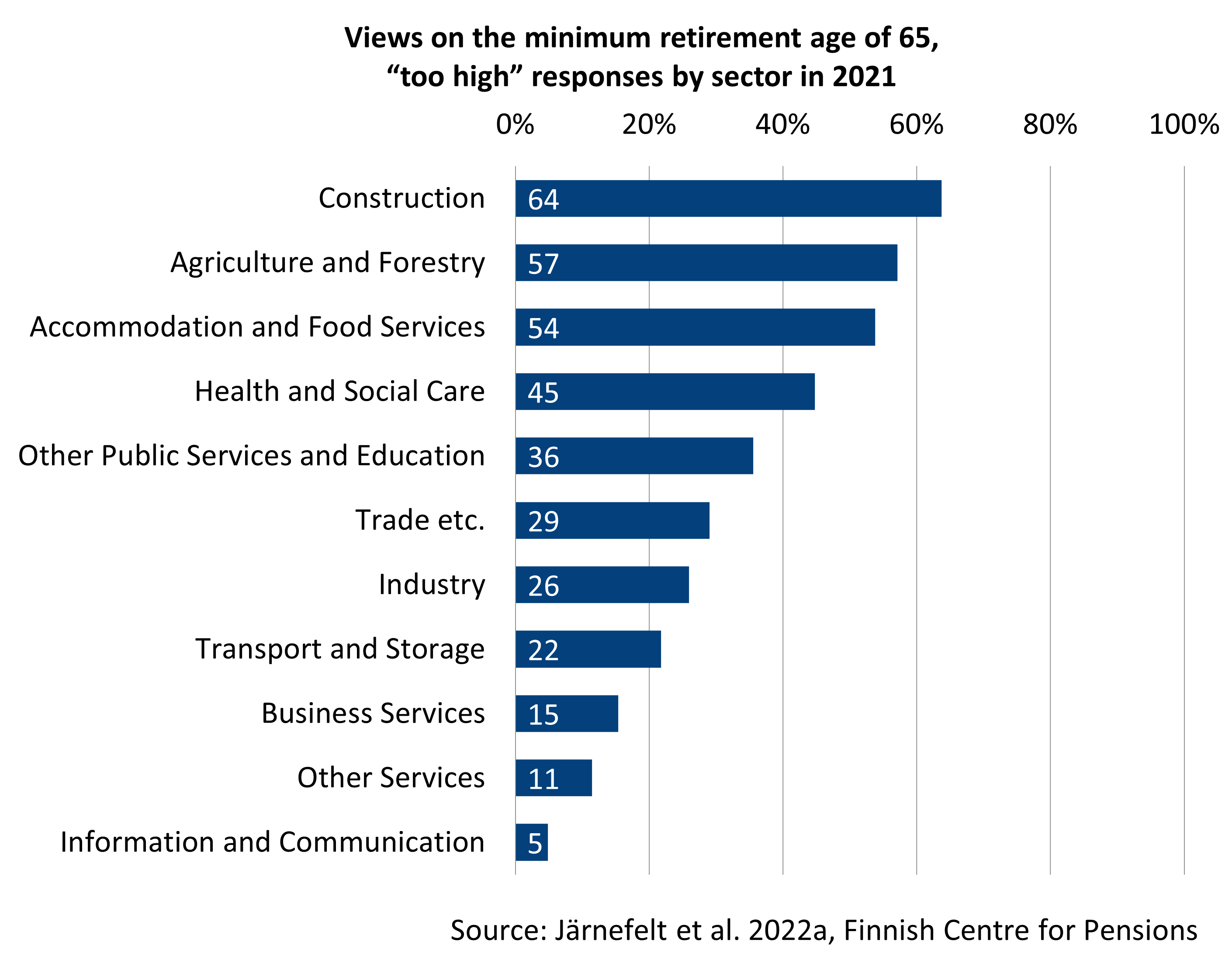 Around two-thirds of employers consider 65 to be an appropriate minimum retirement age. However, there are differences between sectors. For example, more than half of employers in construction, agriculture and forestry, and hotels and restaurants think the minimum age of 65 is too high.