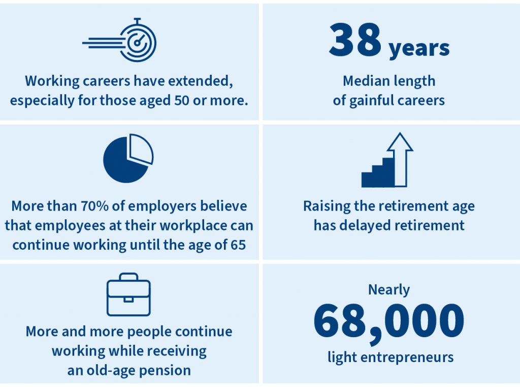 As the retirement age has risen, working careers have extended at the end of working life. People are retiring later and with longer working careers. An increasing number of people are also continuing to work after they have retired on an old-age pension. Socio-economic and gender gaps have narrowed somewhat.