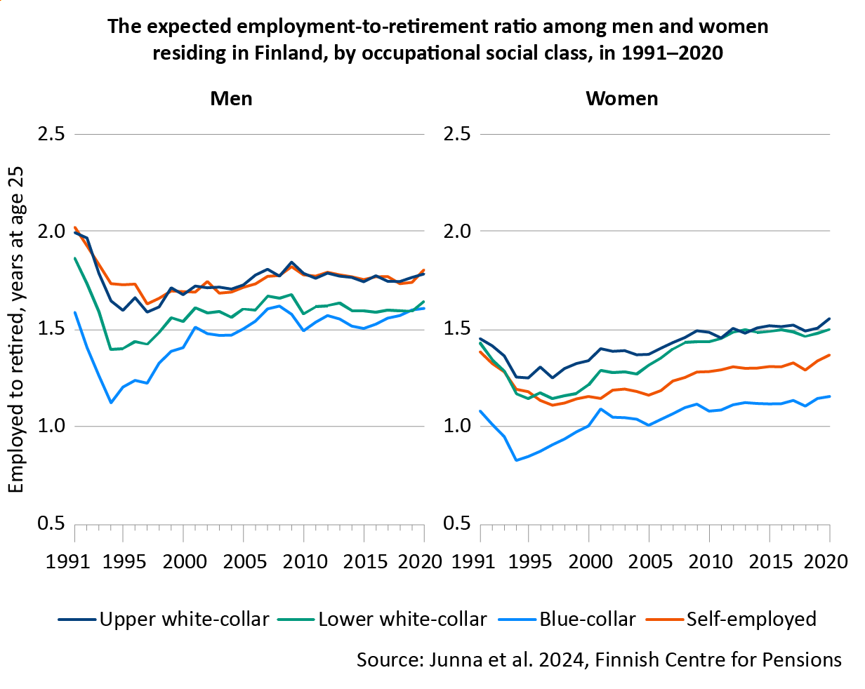 Among men, the gaps have narrowed slightly over the past few decades. In 2020, men in white-collar occupations were expected to work seven years and women nine years longer than their blue-collar counterparts. People in blue-collar occupations also experience longer periods of disability and less time in old-age retirement.