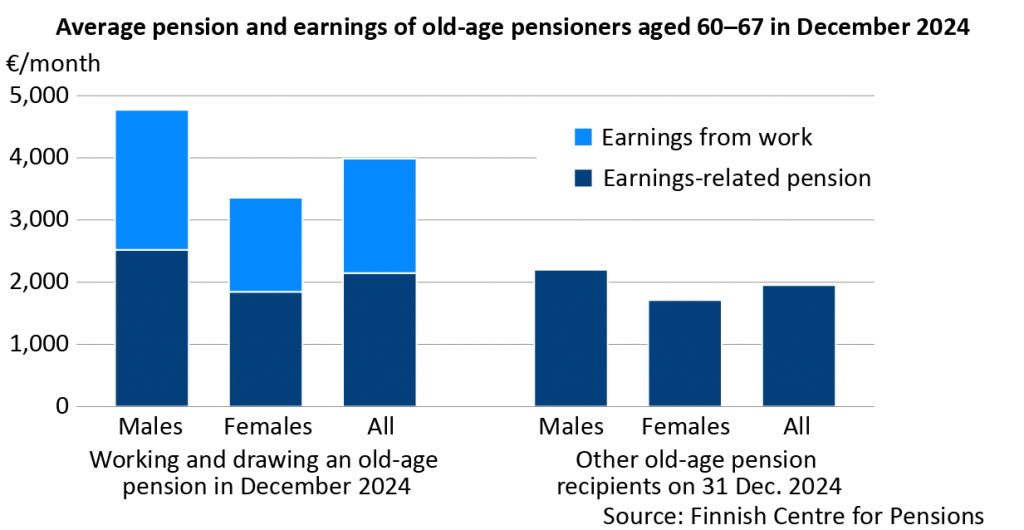 In December 2024, more than 27,000 people aged 60 to 67 worked while receiving a full old-age pension. The average combined monthly income from work and old-age pension of retired med in this age group was nearly 4,800 euros. For women, the average income was just under 3,400 euros. Working almost doubled the monthly income of old-age pensioners in the months they worked. The higher-than-average old-age pensions of working pensioners indicates that the incentive for them to work is not primarily financial.