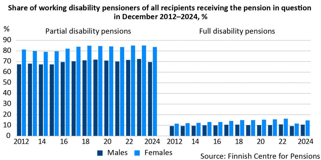 The gap in the number of men and women is particularly wide among those receiving a partial disability pension. This pension benefit is considerably more common among women than men. In line with the goals of this pension benefit, most persons drawing a partial disability pension continue working while drawing the benefit. Of women drawing a partial pension at year-end 2024, roughly 84 per cent worked. For men, the share was more than 10 percentage points lower.
