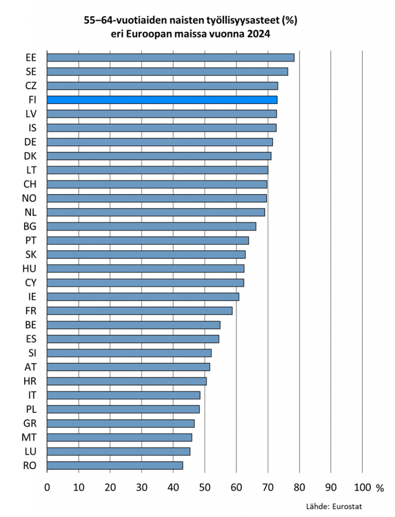 Suomalaisten 55–64-vuotiaiden naisten työssäkäynti on yleisempää kuin monissa muissa Euroopan maissa. Suomalaisnaisten työllisyysaste (73 %) vuonna 2024 oli muiden pohjoismaiden tavoin huomattavasti EU27 -maiden keskiarvoa (59,3 %) korkeampi. Lisäksi tämän ikäisten naisten työllisyysaste on Suomessa miehiä korkeampi, mikä on melko harvinaista koko Euroopassa.