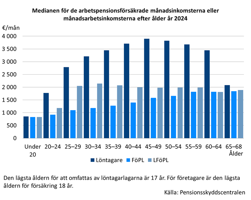 Granskat efter åldersgrupp är de försäkrade månadsinkomsterna som högst hos 45–49-åriga löntagare. Hos dem var medianen 3 902 euro i månaden år 2024.