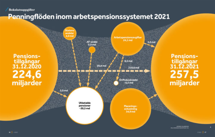 I det nyaste numret av tidskriften Arbetspension presenteras arbetspensionsanstalternas bokslutsuppgifter från år 2021. En visualisering av penningflödena inom arbetspensionssystemet åskådliggör varifrån pengarna kommer och hur mycket det behövdes till pensioner under ett år.