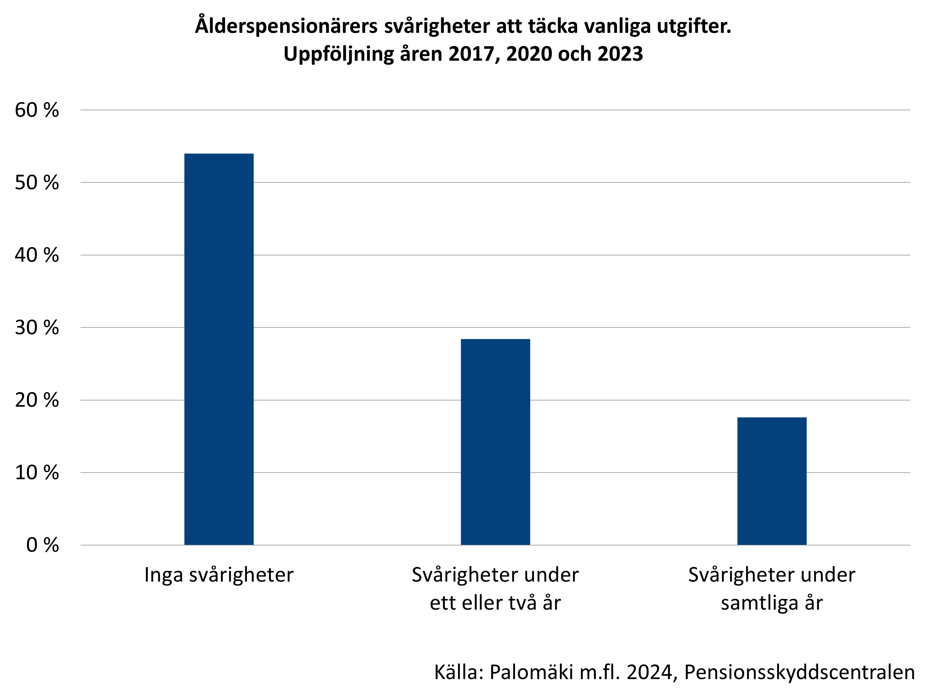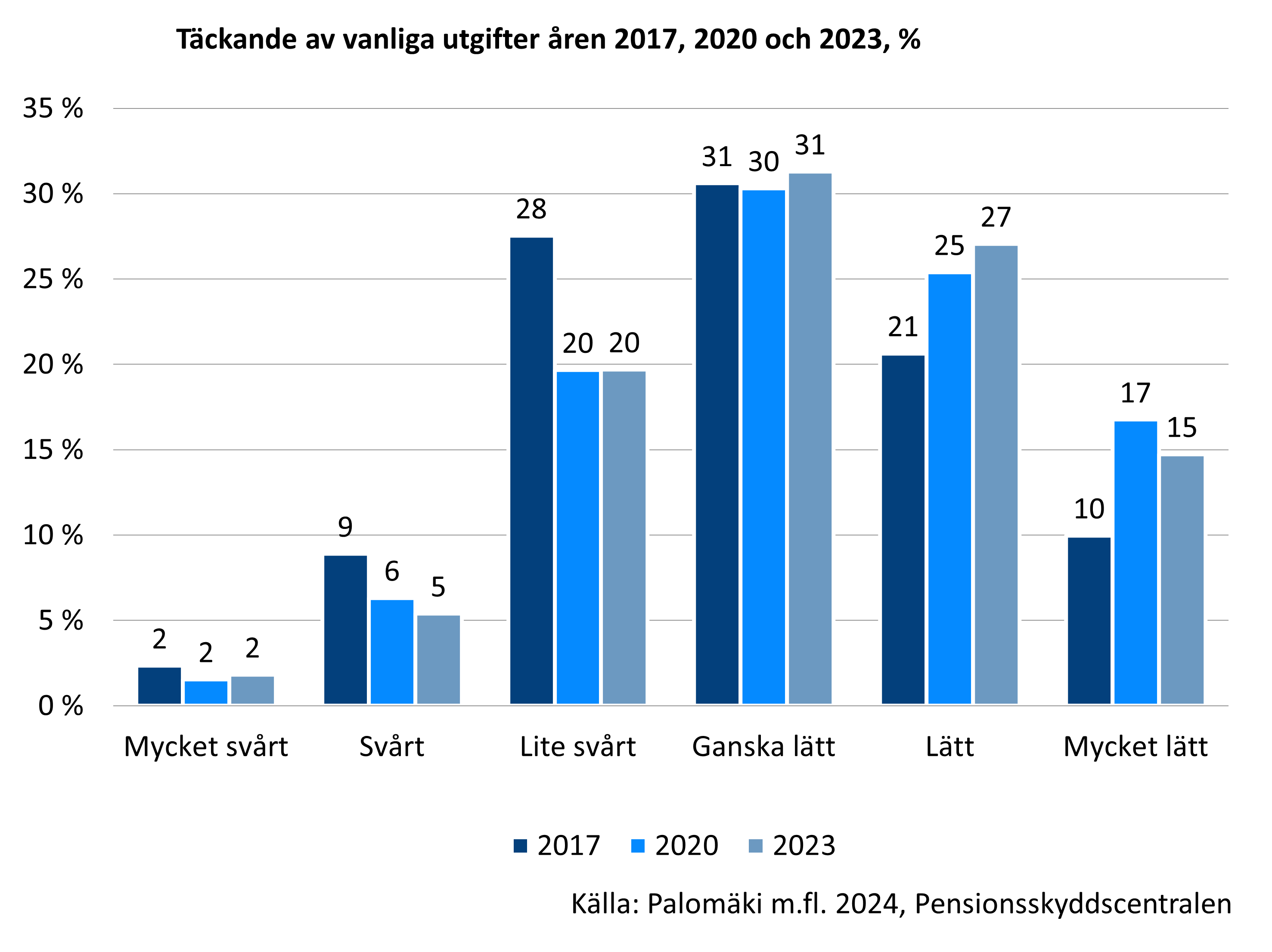 År 2023 upplevde största delen av pensionärerna att det var åtminstone ganska lätt att täcka utgifterna, men ca var fjärde hade svårigheter av någon grad. Oftast var svårigheterna små. Svårare ekonomiska problem upplevdes av mindre än tio procent av pensionärerna. Det var lika vanligt att uppleva svårigheter år 2023 som år 2020, men mer sällsynt än år 2017.