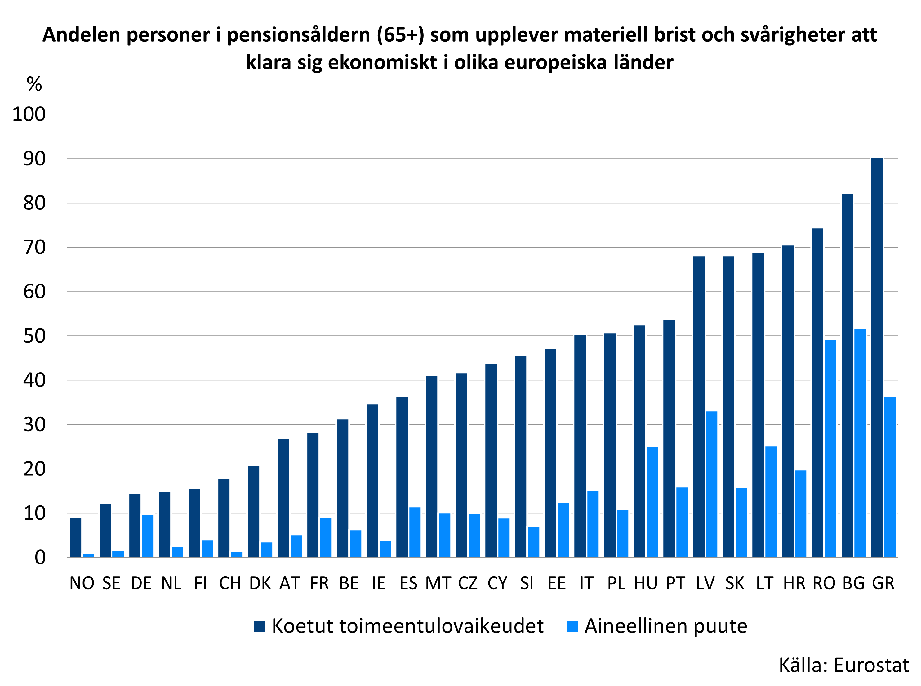 Jämfört med andra europeiska länder upplever finländare i pensionsåldern klart mindre ekonomiska svårigheter än genomsnittet. År 2024 upplevde 16 procent av personerna i pensionsåldern i Finland åtminstone små ekonomiska svårigheter, medan EU-genomsnittet var 43 procent. Motsvarande skillnader mellan länderna konstateras också om vi studerar hur ofta personerna har varit tvungna att på grund av penningbrist avstå från att göra sådant de velat göra.