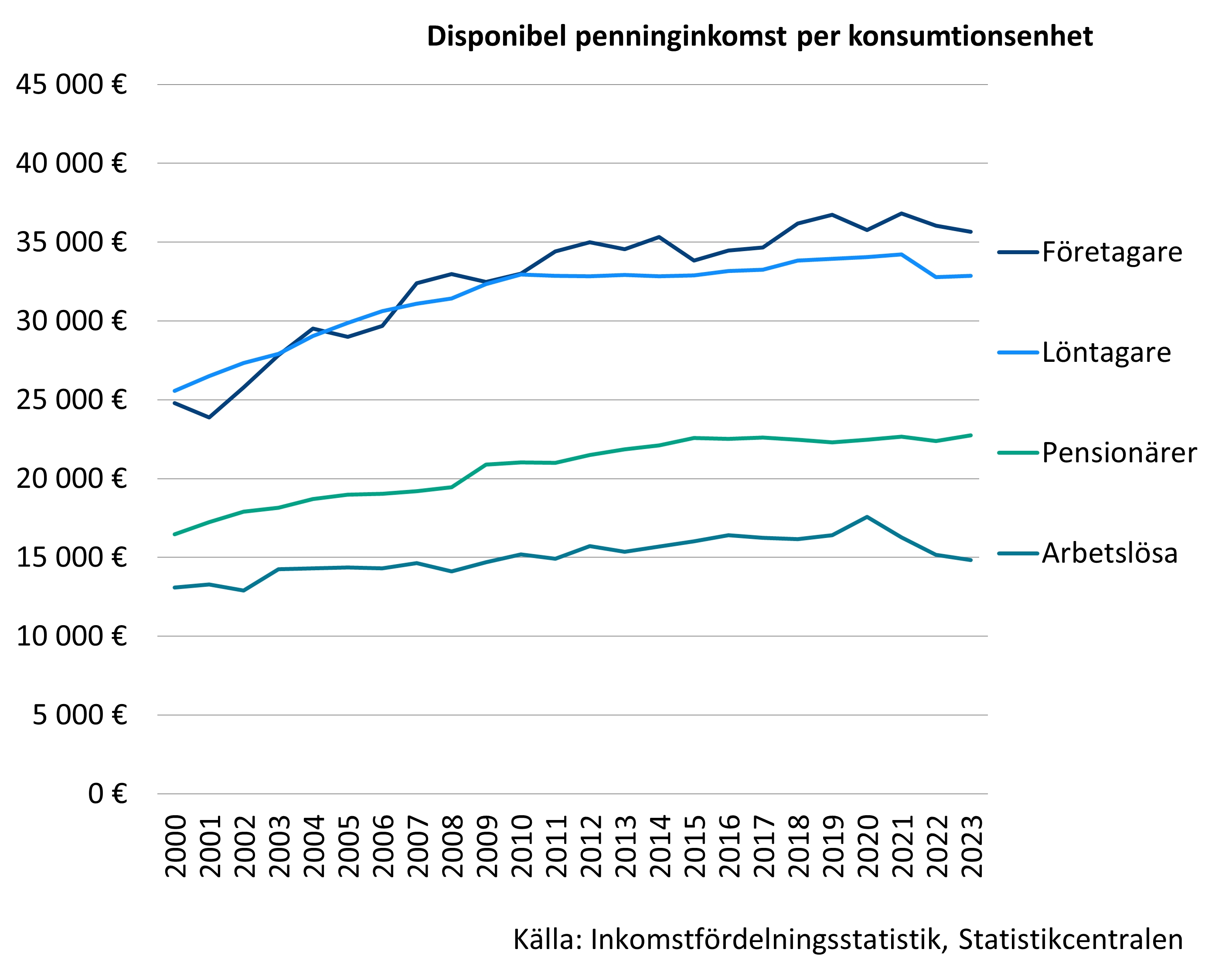 Pensionärernas disponibla penninginkomst är lägre än löntagarnas och företagarnas, men högre än de arbetslösas. På 2000-talet har pensionärernas penninginkomster varit ca två tredjedelar av löntagarnas inkomster. Denna inkomst har hållits ganska oförändrad de senaste årtiondena. Jämfört med arbetslösa har pensionärernas inkomster varit drygt en tredjedel högre på 2000-talet.